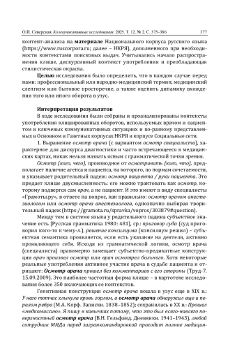 Среди множества аспектов, связанных с изучением медицинского дискурса в контексте функционально-коммуникативной лингвистики, а также социолингвистики, когнитивистики и прагмалингвистики [Алексеева, Мишланова 2002; Карасик 2002: 238–240; Касымова, Линник 2017; Майборода 2017], особое внимание уделяется коммуникации между врачом и пациентом. В этом взаимодействии сталкиваются профессиональная и непрофессиональная языковые личности [Богатикова, Мишланова, Филиппова 2014; Соломенникова 2011; Heritage, Maynard 2006], а также происходит трансформация специализированного знания в обыденное [Голев, Шпильная 2012; Дымова 2011]. В этой связи возникает интерес к разговорным конструкциям и просторечию – как в неформальном общении медицинских работников между собой, так и в общении пациентов в бытовых контекстах.