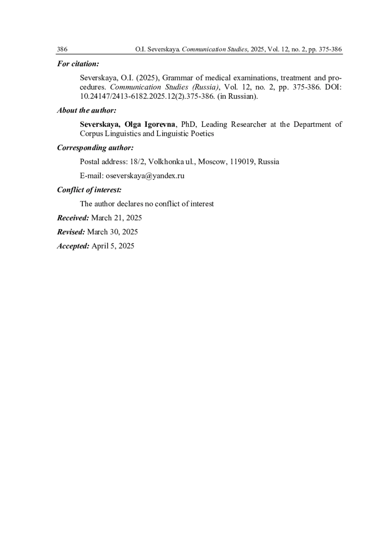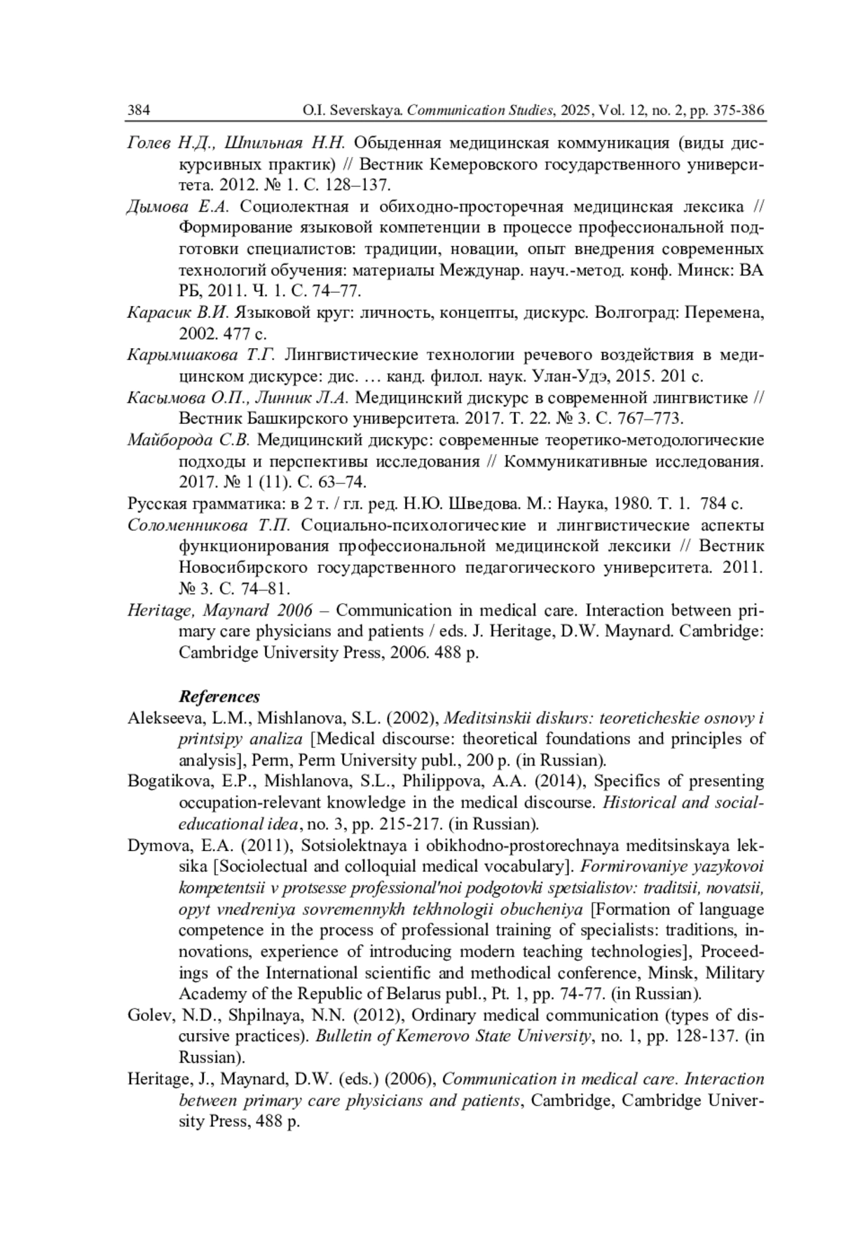 10. Соломенникова Т.П. Социально-психологические и лингвистические аспекты функционирования профессиональной медицинской лексики // Вестник Новосибирского государственного педагогического университета. 2011. № 3. С. 74-81. EDN: OXDITH