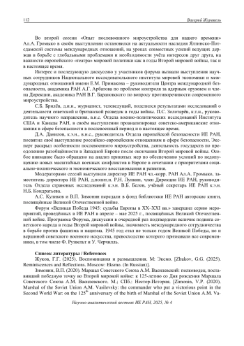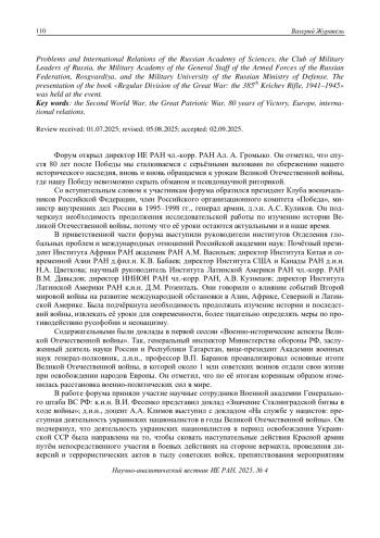 Форум открыл директор ИЕ РАН чл.-корр. РАН Ал. А. Громыко. Он отметил, что спустя 80 лет после Победы мы сталкиваемся с серьёзными вызовами по сбережению нашего исторического наследия, вновь и вновь обращаемся к урокам Великой Отечественной войны, где нашу Победу невозможно скрыть обманом и псевдонаучной риторикой. Со вступительным словом к участникам форума обратился президент Клуба военачальников Российской Федерации, член Российского организационного комитета «Победа», министр внутренних дел России в 1995–1998 гг., генерал армии, д. э. н. А. С. Куликов. Он подчеркнул необходимость продолжения исследовательской работы по изучению истории Великой Отечественной войны, потому что её уроки остаются актуальными и в наше время.