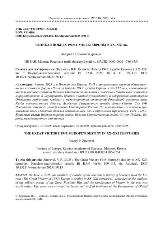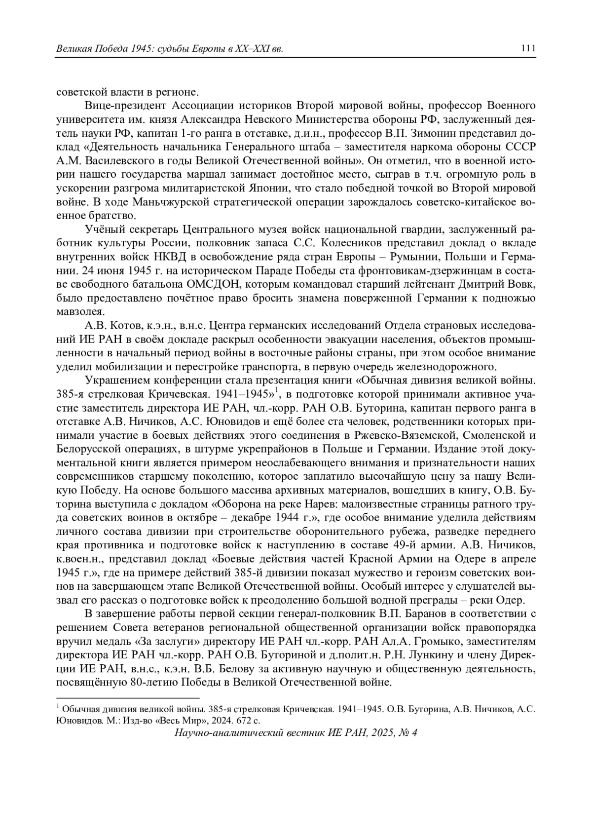 9 июня 2025 г. в Институте Европы РАН с привлечением научной общественности состоялся форум «Великая Победа 1945: судьбы Европы в XX–XXI вв.», посвящённый анализу военных событий Великой Отечественной войны и значению Победы в послевоенном мироустройстве. В мероприятии приняли участие руководители и сотрудники институтов Отделения глобальных проблем и международных отношений Российской академии наук, Клуба военачальников России, Академии Генерального штаба Вооружённых Сил РФ, Росгвардии, Военного университета Минобороны России. На мероприятии состоялась презентация книги «Обычная дивизия великой войны. 385-я стрелковая Кричевская. 1941–1945»