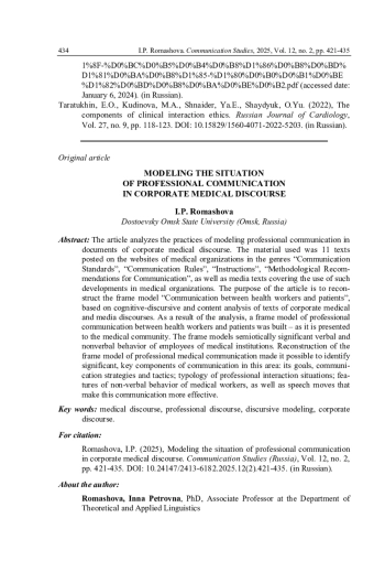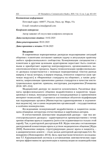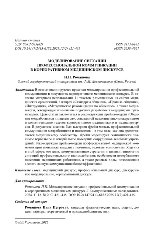В статье анализируются практики моделирования профессиональной коммуникации в документах корпоративного медицинского дискурса. В качестве материала использованы 11 текстов, размещенных на сайтах медицинских организаций, в жанрах «Стандарты общения», «Правила общения», «Инструкция», «Методические рекомендации по общению», а также медиатексты, освещающие применение подобных разработок в медицинских организациях. Цель статьи заключается в реконструкции фрейма-модели «Общение медработников и пациентов», основанной на когнитивно-дискурсивном и контент-анализе текстов корпоративного медицинского и медиадискурсов. В результате анализа был выстроен фрейм-модель профессиональной коммуникации медработников и пациентов - в том виде, как она представляется медицинскому сообществу. Фрейм моделирует семиотически значимое вербальное и невербальное поведение сотрудников лечебных учреждений. Реконструкция фрейма-модели профессиональной медицинской коммуникации позволила выделить значимые, узловые компоненты общения в этой сфере: его цели, коммуникативные стратегии и тактики; типологию ситуаций профессионального взаимодействия; особенности невербального поведения медицинских работников, а также речевые ходы, позволяющие сделать данную коммуникацию более эффективной
