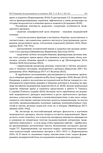 13. Пономаренко Е.А. Жанровая организация речевого общения врача и пациента: автореф. дис. … д-ра филол. наук. Симферополь, 2014. 44 с. EDN: ZPHUAR