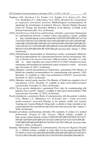 25. Минздрав составил рекомендации по общению с пациентами при записи на прием // ТАСС. 2022. 12 дек. URL: https://tass.ru/obschestvo/16565671 (дата обращения: 22.11.2023).