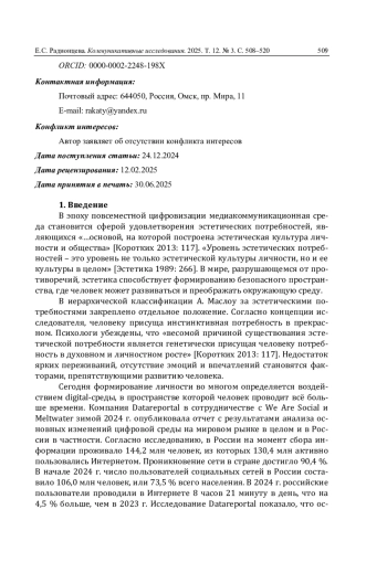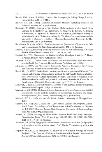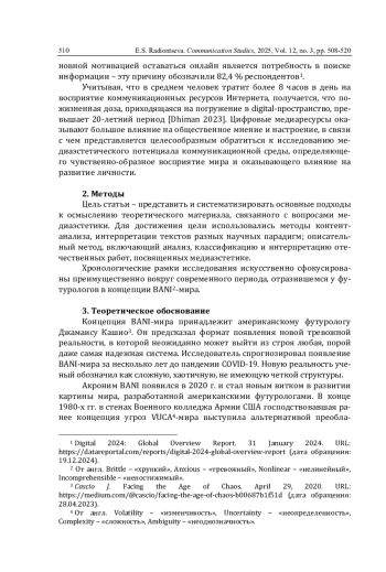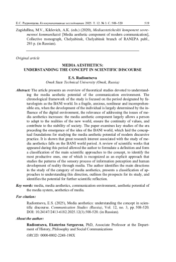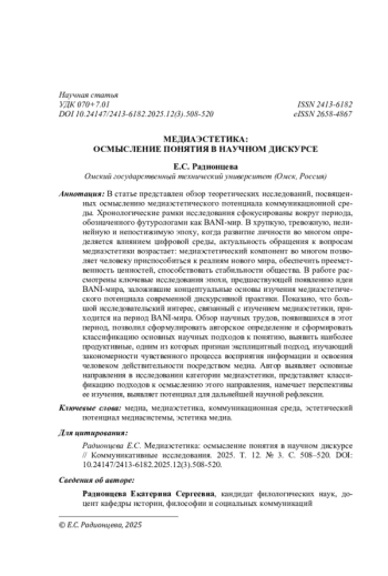 В статье представлен обзор теоретических исследований, посвященных осмыслению медиаэстетического потенциала коммуникационной среды. Хронологические рамки исследования сфокусированы вокруг периода, обозначенного футурологами как BANI-мир. В хрупкую, тревожную, нелинейную и непостижимую эпоху, когда развитие личности во многом определяется влиянием цифровой среды, актуальность обращения к вопросам медиаэстетики возрастает: медиаэстетический компонент во многом позволяет человеку приспособиться к реалиям нового мира, обеспечить преемственность ценностей, способствовать стабильности общества. В работе рассмотрены ключевые исследования эпохи, предшествующей появлению идеи BANI-мира, заложившие концептуальные основы изучения медиаэстетического потенциала современной дискурсивной практики. Показано, что большой исследовательский интерес, связанный с изучением медиаэстетики, приходится на период BANI-мира. Обзор научных трудов, появившихся в этот период, позволил сформулировать авторское определение и сформировать классификацию основных научных подходов к понятию, выявить наиболее продуктивные, одним из которых признан эксплицитный подход, изучающий закономерности чувственного процесса восприятия информации и освоения человеком действительности посредством медиа. Автор выявляет основные направления в исследовании категории медиаэстетики, представляет классификацию подходов к осмыслению этого направления, намечает перспективы ее изучения, выявляет потенциал для дальнейшей научной рефлексии