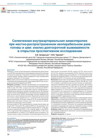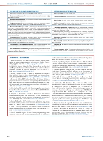 13. Olshansky MS, Znatkova NA, Shklyarov AYu, et al. Selective Intra-Arterial Chemoinfusion with Palliative Purpose in Patients with Relapses of Squamous Cell Carcinoma of the Head and Neck after Completed Chemoradiotherapy. Journal of oncology: diagnostic radiology and radiotherapy. 2020;3(2):51-62. DOI: 10.37174/2587-7593-2020-3-2-51-62