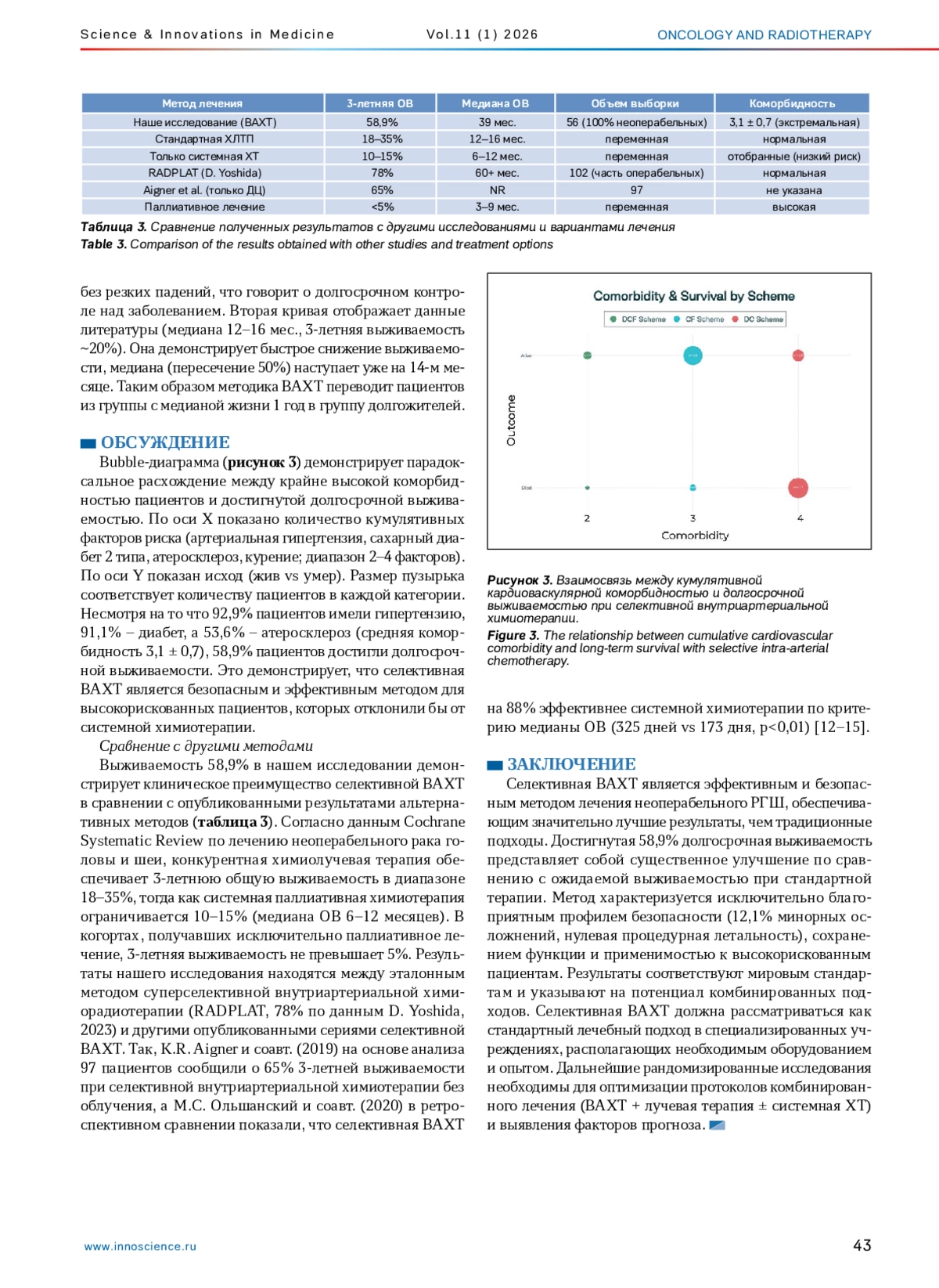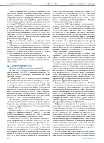 Результаты. Из 56 исходно включенных пациентов на момент написания статьи (конец 2025 года) живы 33 пациента (58,9%, 95% ДИ: 44,7–72,6). Это составляет существенно более высокое значение по сравнению с ожидаемой выживаемостью при стандартном лечении, при котором этот показатель не превышает 15–20% через 24–39 месяцев. Средний ответ опухоли на лечение составил 7,9±5,4 по суррогатному показателю эффекта (диапазон: 3,2–31,9). Частота осложнений была низкой (12,1%, n=4), включала отек слизистой (n=1), гиперсаливацию (n=1), затекание контраста в соседние структуры (n=1), першение и чувство нехватки воздуха (n=1). Ни одного летального исхода, непосредственно связанного с процедурой ВАХТ, зафиксировано не было.