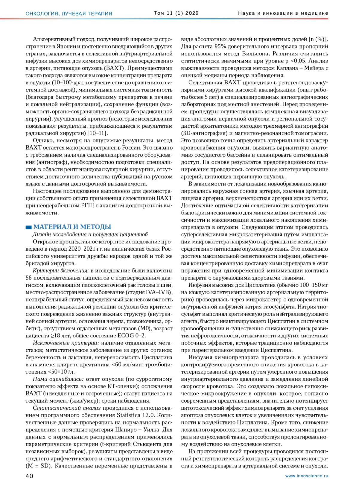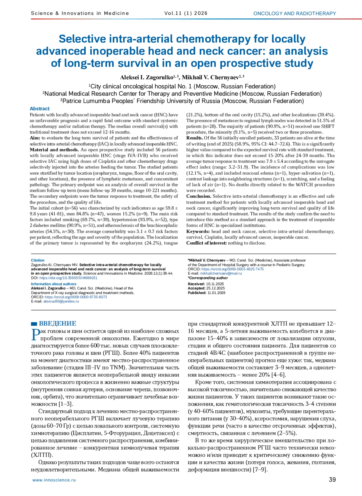 Рак головы и шеи остается одной из наиболее сложных проблем современной онкологии. Ежегодно в мире диагностируется более 600 тыс. новых случаев плоскоклеточного рака головы и шеи (РГШ). Более 40% пациентов на момент диагностики имеют местно-распространенное заболевание (стадия III–IV по TNM). Значительная часть этих пациентов является неоперабельной ввиду инвазии онкологического процесса в жизненно важные структуры (внутренняя сонная артерия, основание черепа, позвоночник, орбита), что значительно ограничивает лечебные возможности [1–3].