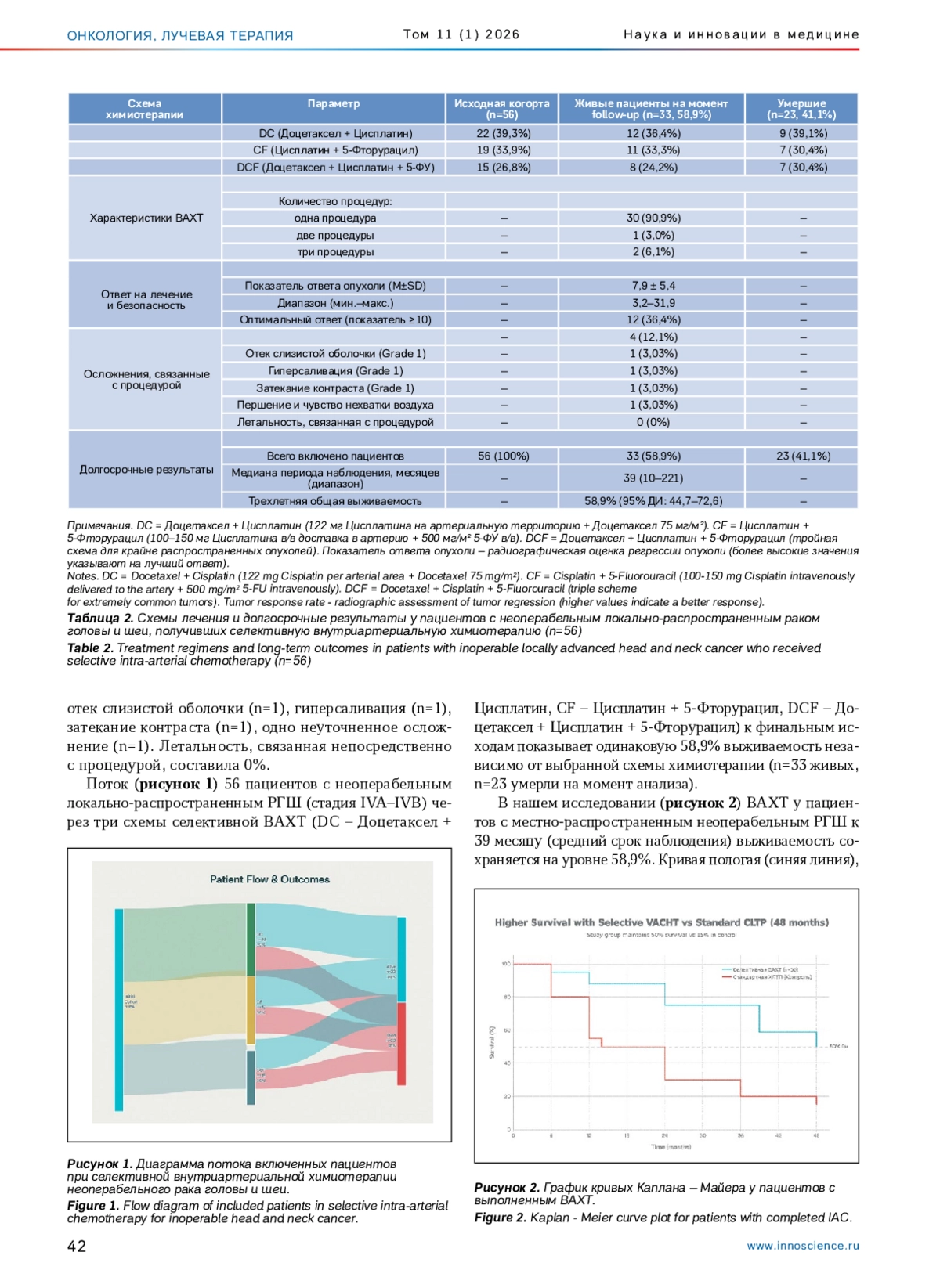 Материал и методы. В открытое проспективное исследование были включены 56 пациентов с местно-распространенным неоперабельным РГШ (стадия IVA–IVB), которые получали селективную ВАХТ с использованием высоких доз Цисплатина и других химиопрепаратов с избирательным введением в артерии, питающие опухоль. Исследуемые пациенты были стратифицированы по локализации опухоли (ротоглотка, язык, дно полости рта, другие локализации), наличию лимфатических метастазов и сопутствующей патологии. Первичной конечной точкой был анализ общей выживаемости в среднесрочной перспективе (среднее наблюдение 39 месяцев, диапазон 10–221 месяц) наблюдения. Вторичными конечными точками стали ответ опухоли на лечение, безопасность процедуры, качество жизни.