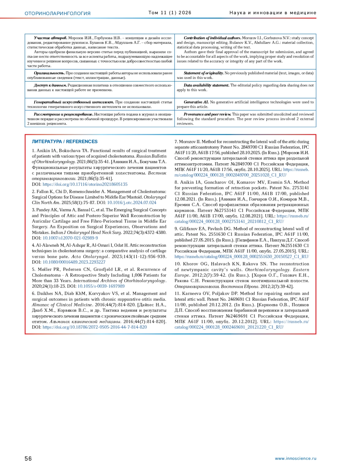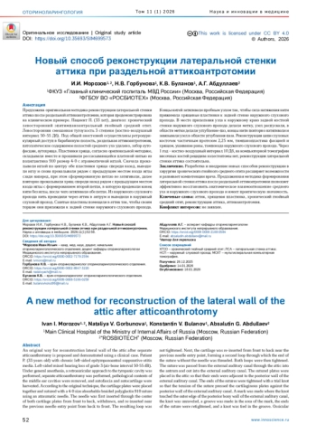 7. Morozov II. Method for reconstructing the lateral wall of the attic during separate atticoantrotomy Patent No. 2849700 C1 Russian Federation, IPC A61F 11/20, A61B 17/56, published 28.10.2025. URL: https://rusneb.ru/catalog/000224_000128_0002849700_20251028_C1_RU.