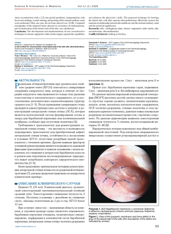 10. Khorov OG, Halavach KN, Rakova SN. The reconstruction of newtympanic cavity’s walls. Otorhinolaryngology. Eastern Europe. 2012;2(7):39-42.