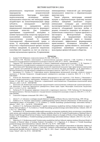 5. Наговицын Р.С., Гилязов Р.Г. Структурная модель формирования музыкальной культуры личности студента института // Вестник Казанского государственного университета культуры и искусств. 2024. № 1. С. 74-79. EDN: STJHIT
