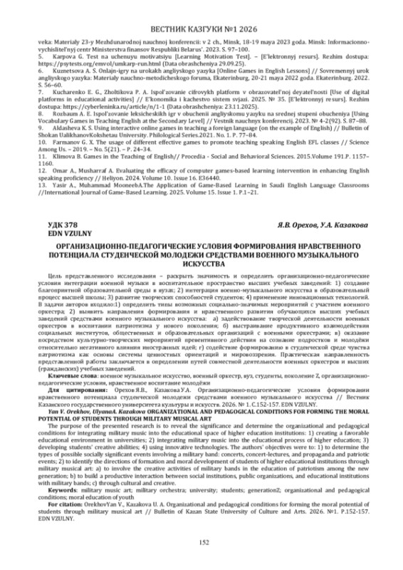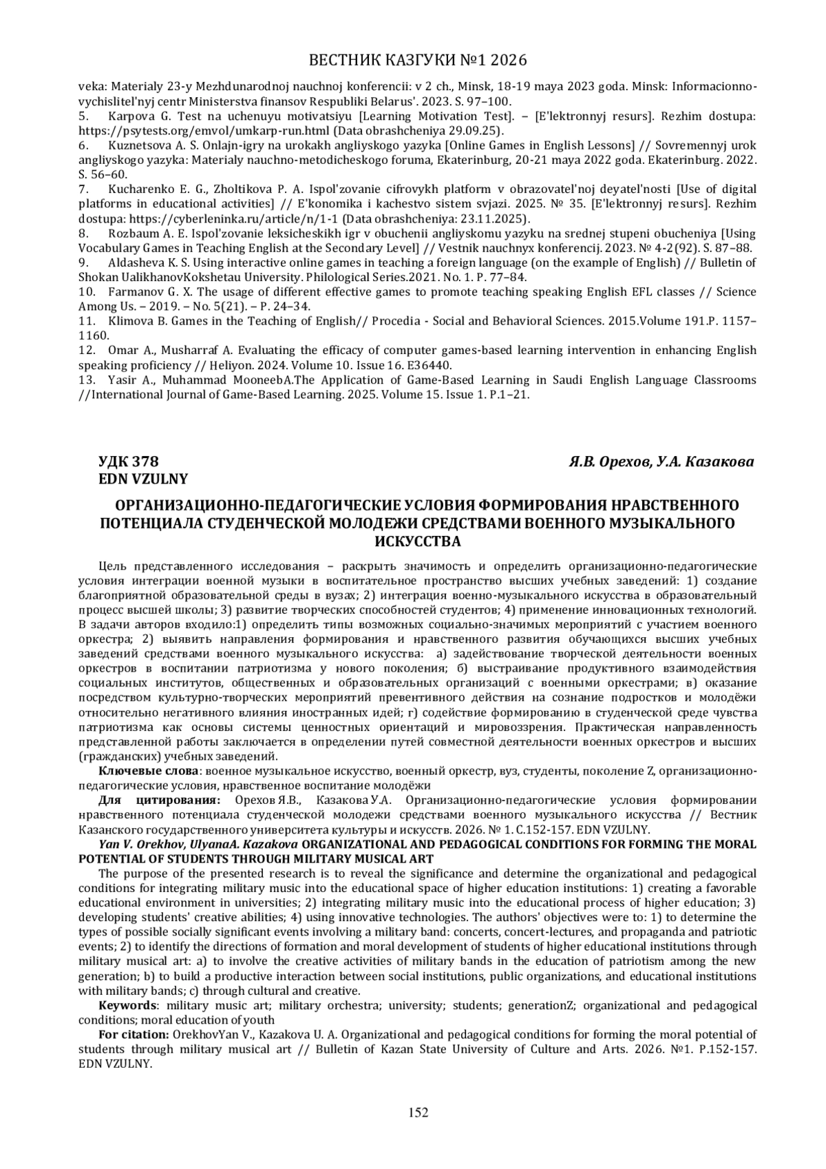 4. Давлетшина Д.М. Трансформация духовных ценностей современной молодежи через нравственное возрождение нации: поиски, пути решения (на примере работ великого мыслителя Абу Наср аль-Фараби) / Д. М. Давлетшина // Вестник Казанского государственного университета культуры и искусств. 2025. № 2. С. 12-20. EDN: JTQXRC