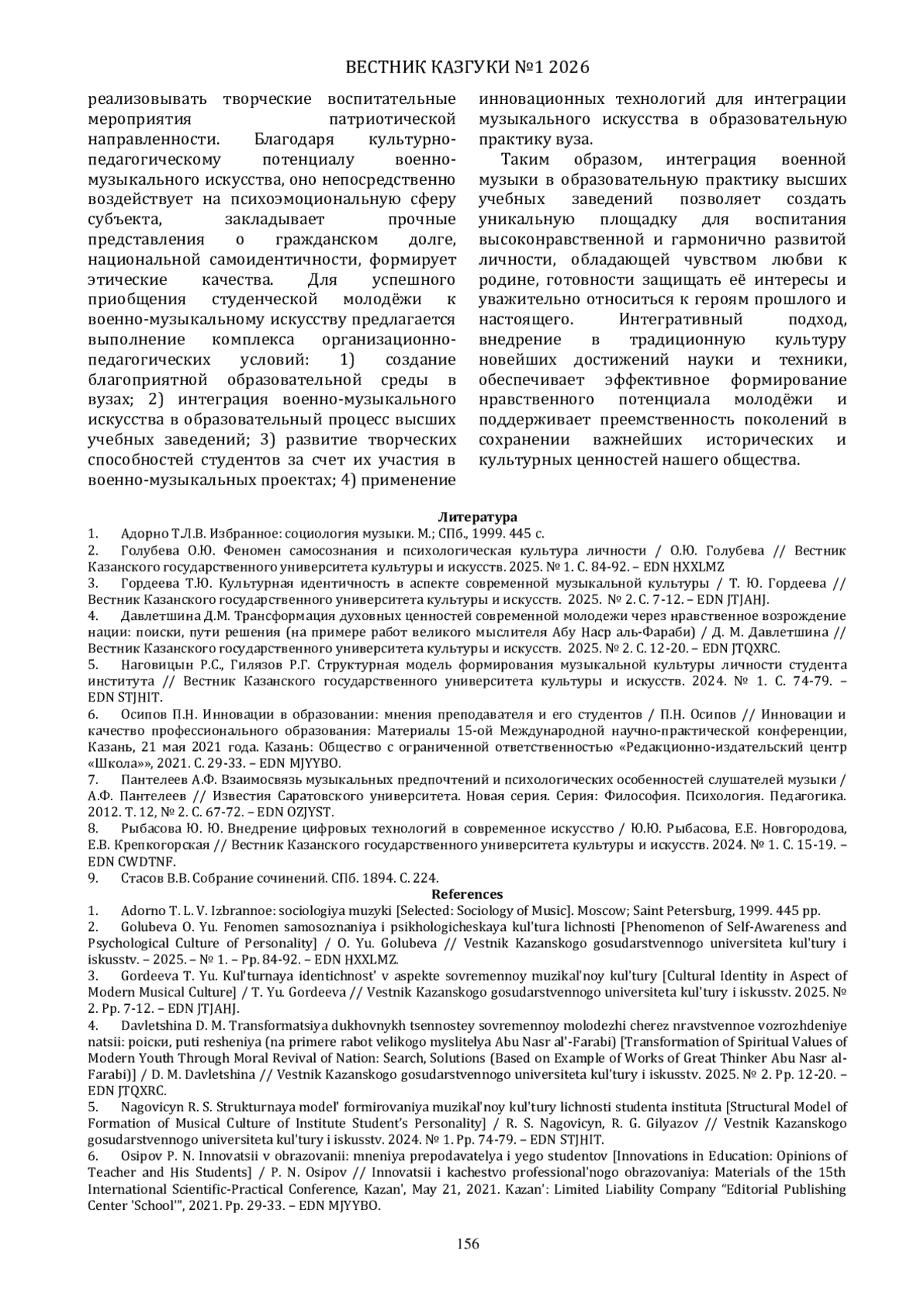 3. Гордеева Т.Ю. Культурная идентичность в аспекте современной музыкальной культуры / Т. Ю. Гордеева // Вестник Казанского государственного университета культуры и искусств. 2025. № 2. С. 7-12. EDN: JTJAHJ
