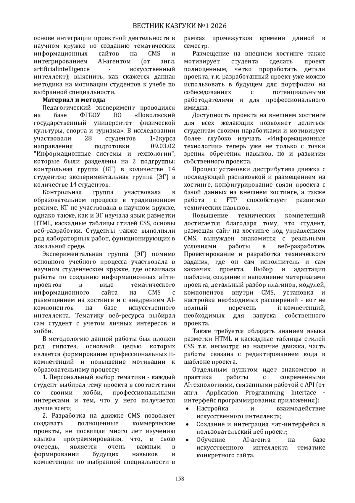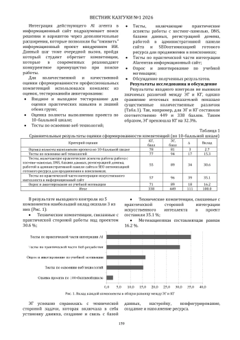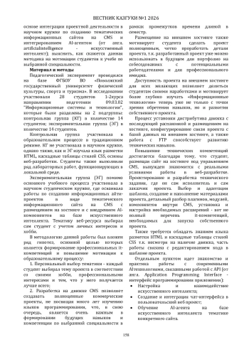 В статье рассматривается проблема формирования практико-ориентированных профессиональных компетенций у студентов IT-специальностей в условиях цифровой трансформации образования. Исследование посвящено анализу эффективности интеграции проектной деятельности в работу студенческого научного кружка. Представлены результаты педагогического эксперимента, в рамках которого была реализована методика разработки тематических информационных сайтов на CMS (система управления контентом) с интегрированным искусственным интеллектом. Особенностью методики является персонализированный подход к выбору тематики сайтов на основе интересов студентов, разработка информационного ресурса с искусственным интеллектом с последующей оценкой проектов. Обоснована эффективность сочетания проектной деятельности в научном кружке для формирования мотивации и профессиональных компетенций.