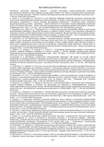 13. Намазова Л. Б., Котляров В. В., Тиджини Ю., Скворцова Е. И. Искусственный интеллект в образовании: новые возможности и трудности // Междисциплинарность научных исследований как фактор инновационного развития: Сборник статей Международной научно-практической конференции, Уфа, 12 июня 2025 года. - Уфа: Общество с ограниченной ответственностью “ОМЕГА САЙНС”, 2025. - С. 106-108. EDN: MXBUTL