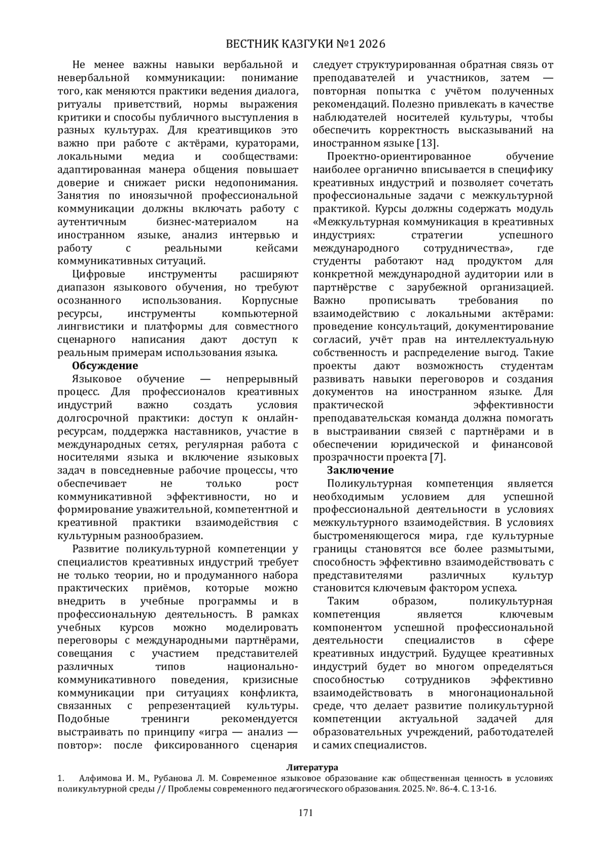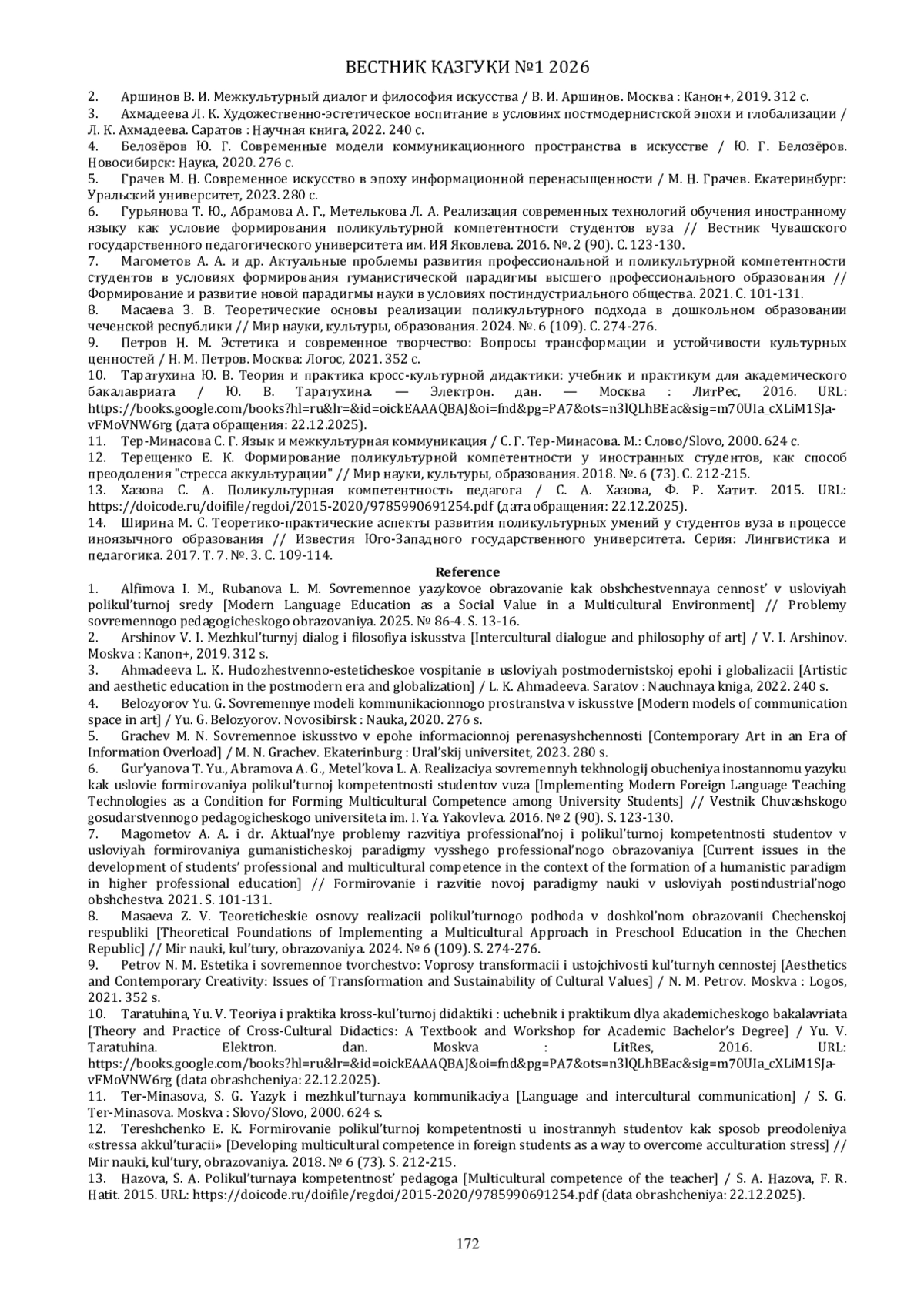 1. Алфимова И. М., Рубанова Л. М. Современное языковое образование как общественная ценность в условиях поликультурной среды // Проблемы современного педагогического образования. 2025. №. 86-4. С. 13-16. EDN: XTXMAI