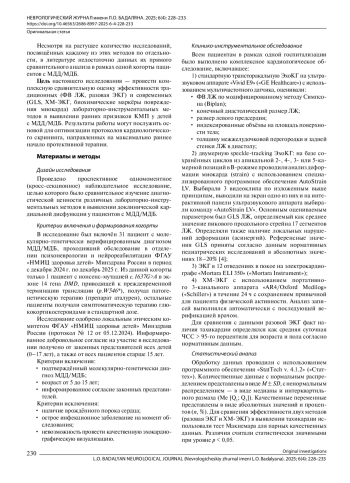 Заключение. Методы speckle-tracking ЭхоКГ и ХМ-ЭКГ обладают существенно более высокой чувствительностью в выявлении доклинической КМП при МДД/МДБ по сравнению со стандартным скринингом. Их комбинированное применение с определением NT-proBNP и тропонина I позволяет стратифицировать риск и обосновать раннее начало кардиопротективной терапии.