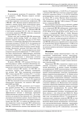 Материалы и методы. В проспективное кросс-секционное исследование был включён 31 пациент с мышечной дистрофией Дюшенна/Беккера (МДД/МДБ). Всем пациентам выполнена комплексная оценка: эхокардиография (ЭхоКГ) с анализом GLS, ХМ-ЭКГ, определение уровней предсердного натрийуретического пептида (NT-proBNP) и тропонина I.