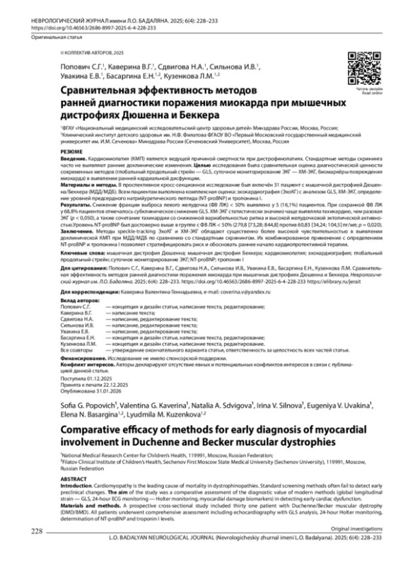 Кардиомиопатия (КМП) является ведущей причиной смертности при дистрофинопатиях. Стандартные методы скрининга часто не выявляют ранние доклинические изменения. Целью исследования была сравнительная оценка диагностической ценности современных методов (глобальный продольный стрейн — GLS, суточное мониторирование ЭКГ — ХМ-ЭКГ, биомаркёры повреждения миокарда) в выявлении ранней кардиальной дисфункции.