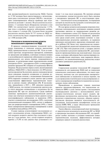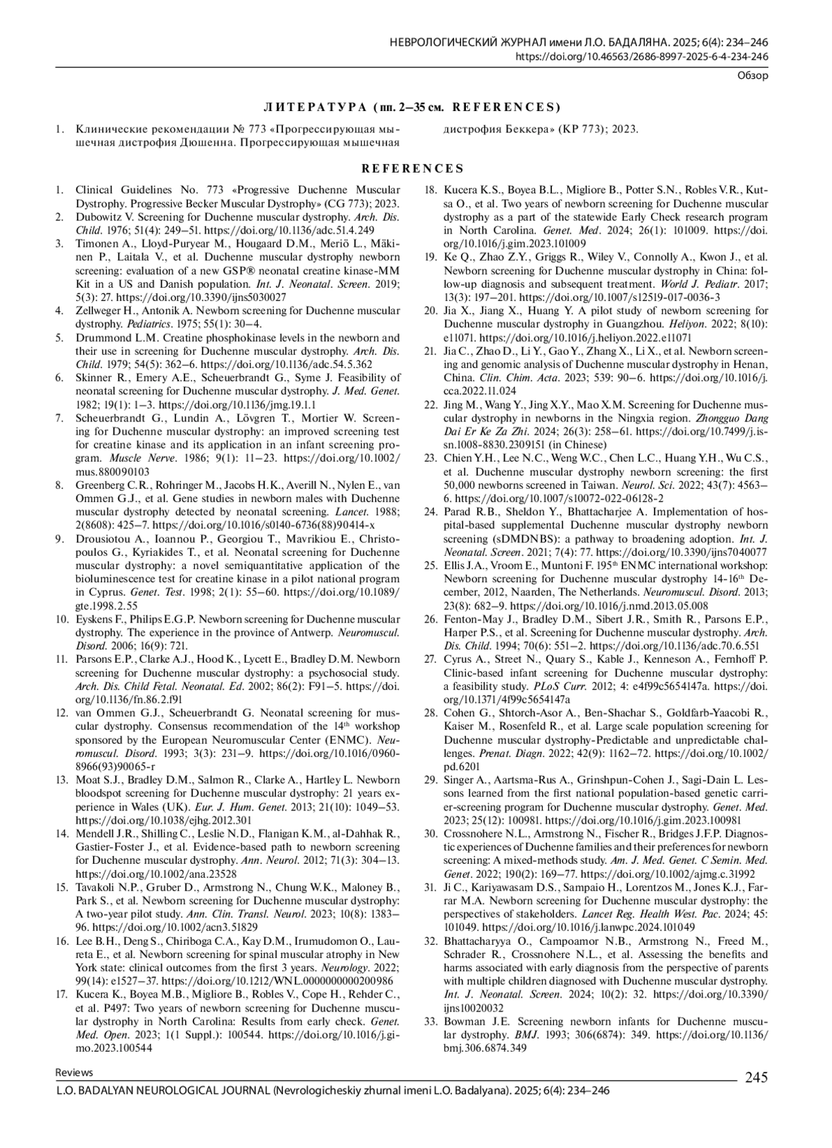 18. Kucera K.S., Boyea B.L., Migliore B., Potter S.N., Robles V.R., Kutsa O., et al. Two years of newborn screening for Duchenne muscular dystrophy as a part of the statewide Early Check research program in North Carolina. Genet. Med. 2024; 26(1): 101009. DOI: 10.1016/j.gim.2023.101009