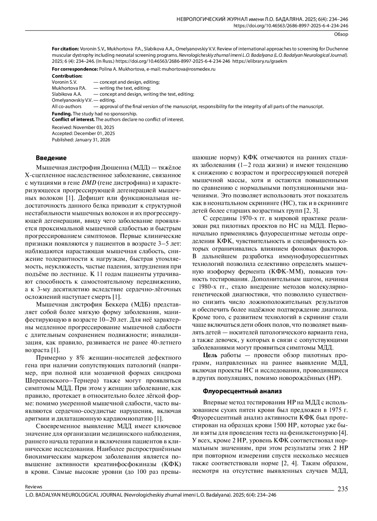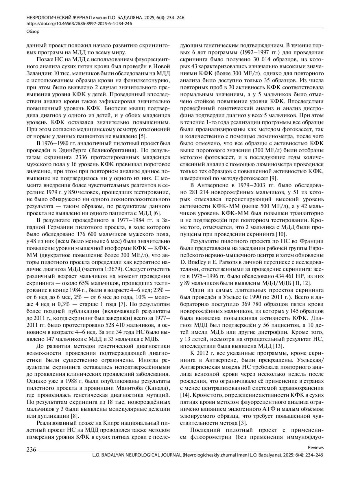 Мышечная дистрофия Дюшенна (МДД) — одно из наиболее тяжёлых и распространённых наследственных нервно-мышечных заболеваний, характеризующееся прогрессирующей дегенерацией мышечной ткани, утратой двигательных функций и ранней смертностью пациентов. Несмотря на наличие определённых терапевтических опций, исход заболевания во многом зависит от сроков постановки диагноза и начала наблюдения. Одним из наиболее перспективных направлений раннего выявления заболевания является неонатальный скрининг, основанный на определении активности креатинфосфокиназы (КФК) в образцах сухих пятен крови с последующим генетическим подтверждением диагноза. В мировой практике проведено множество пилотных проектов скрининга новорождённых на МДД с применением различных аналитических подходов, включая флуоресцентный и иммунофлуоресцентный анализ КФК для выявления пациентов группы повышенного риска, а также применение молекулярно-генетических методов для подтверждения диагноза. В данной работе представлен обзор истории развития и текущего состояния программ скрининга на МДД в разных странах мира, а также ключевые этические и психологические аспекты досимптоматической диагностики МДД.