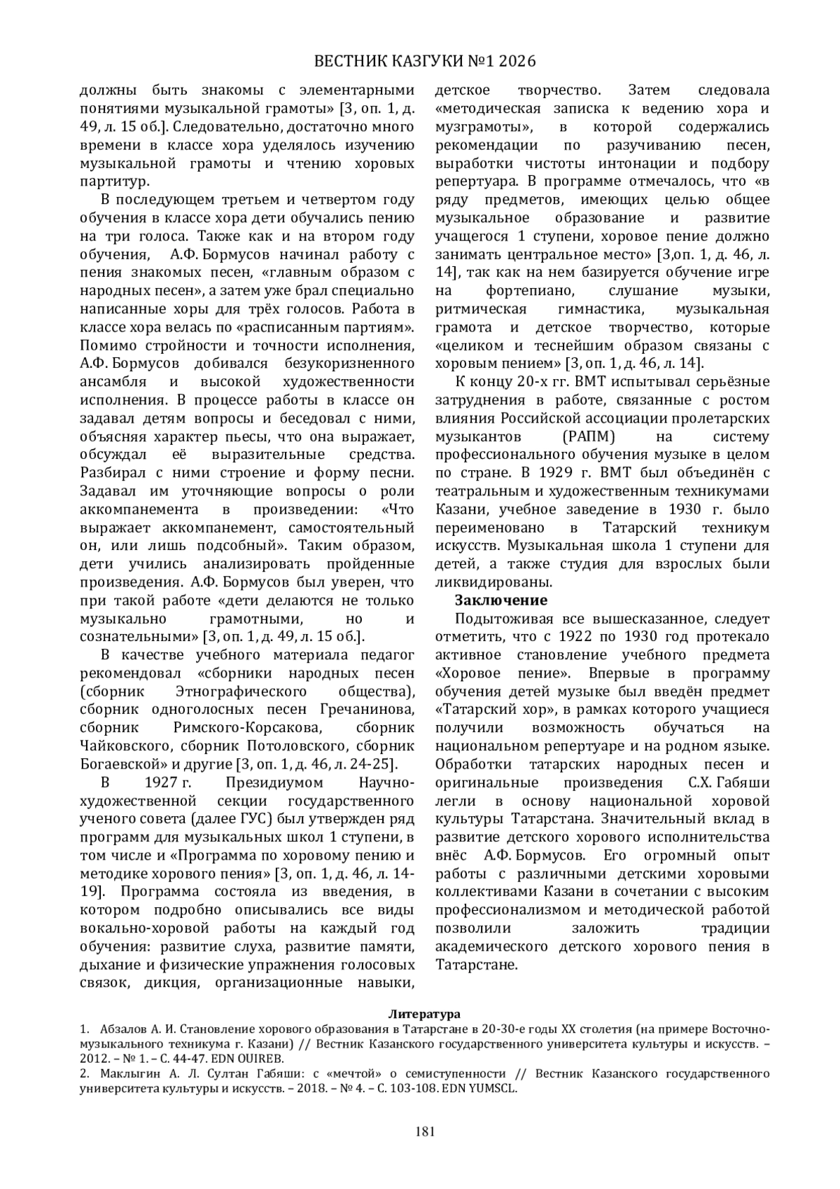 1. Абзалов А. И. Становление хорового образования в Татарстане в 20-30-е годы ХХ столетия (на примере Восточно-музыкального техникума г. Казани) // Вестник Казанского государственного университета культуры и искусств. - 2012. - № 1. - С. 44-47. EDN: OUIREB
