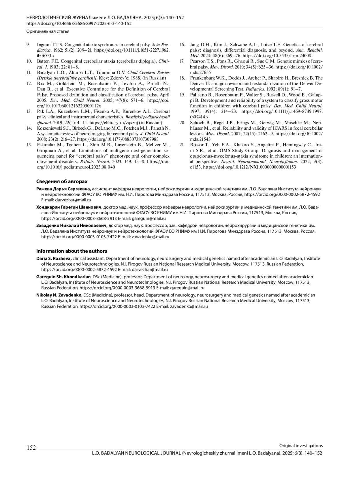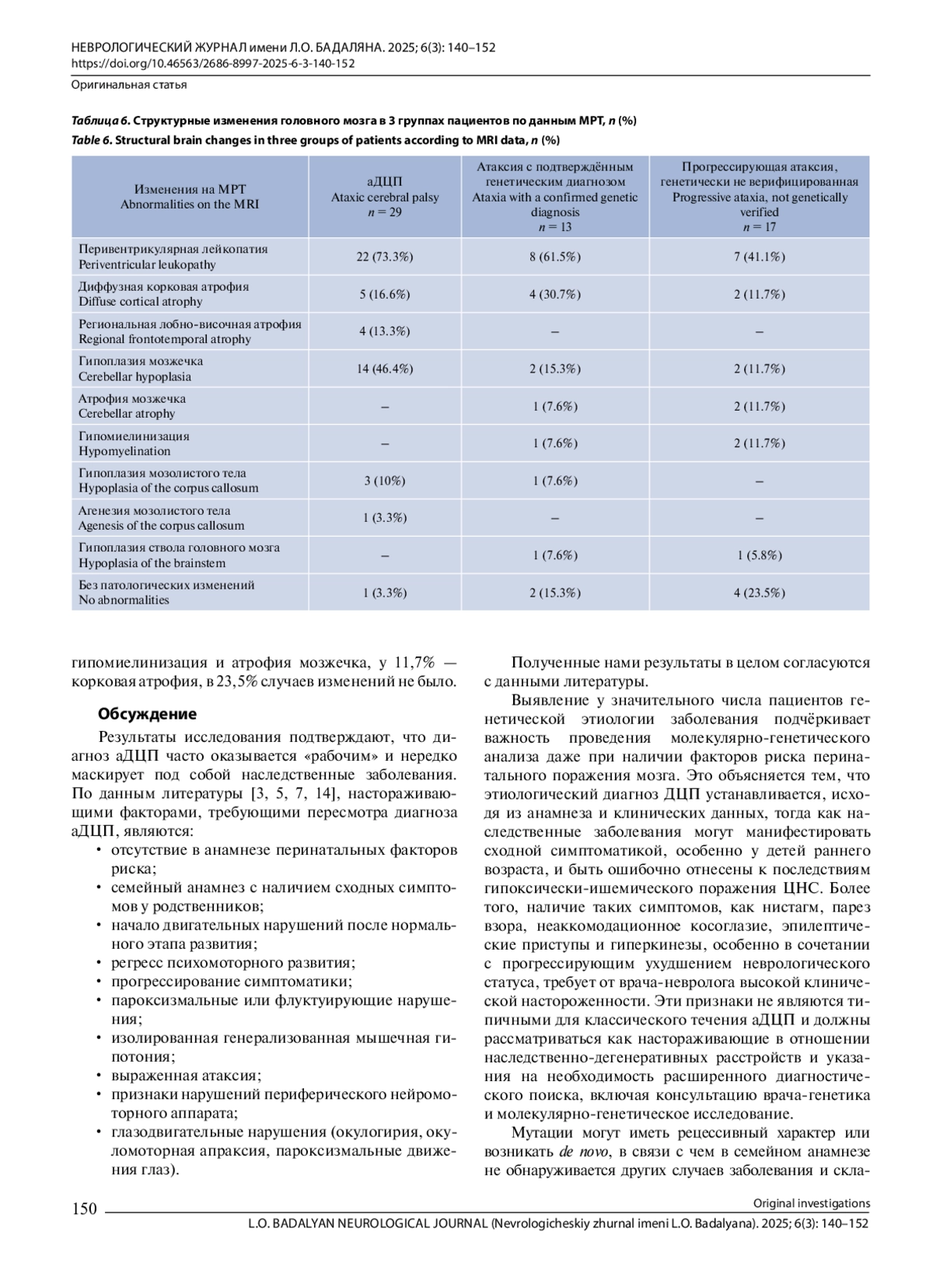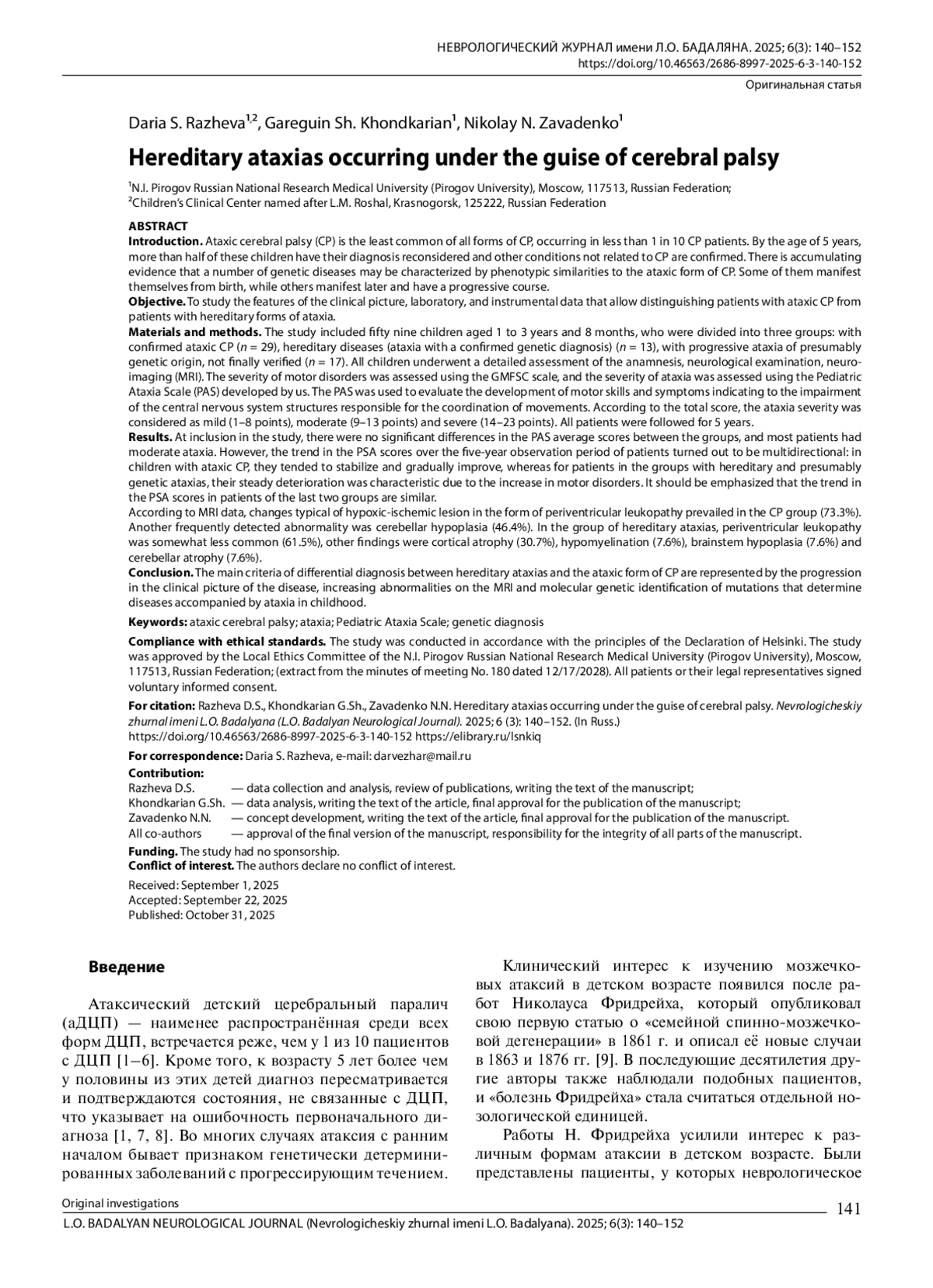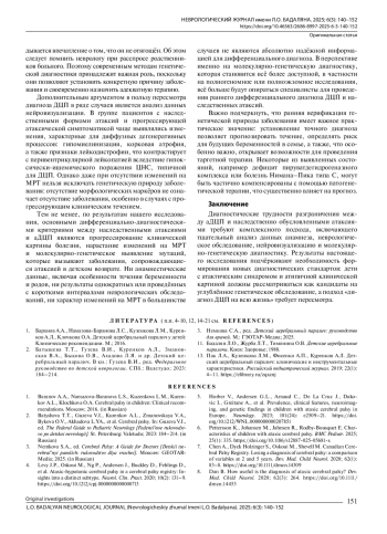 Заключение. Основными дифференциально-диагностическими критериями между наследственно обусловленными атаксиями и аДЦП являются прогрессирование клинической картины болезни, нарастание изменений на МРТ и молекулярно-генетическое выявление мутаций, которые вызывают заболевания, сопровождающиеся атаксией в детском возрасте.
