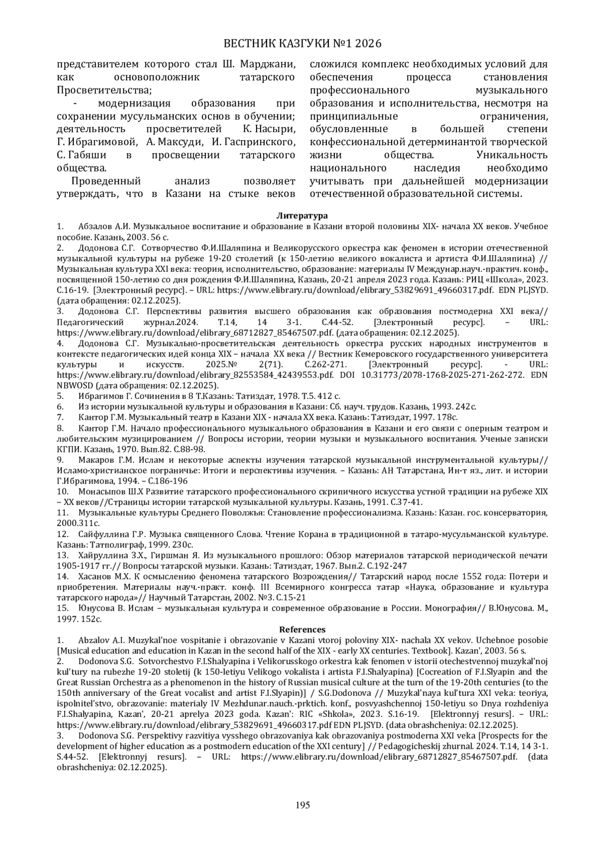 4. Додонова С.Г. Музыкально-просветительская деятельность оркестра русских народных инструментов в контексте педагогических идей конца XIX - начала XX века // Вестник Кемеровского государственного университета культуры и искусств. 2025.№ 2(71). С.262-271. [Электронный ресурс]. - URL: download/elibrary_82553584_42439553.pdf. (дата обращения: 02.12.2025). DOI: 10.31773/2078-1768-2025-271-262-272 EDN: NBWOSD