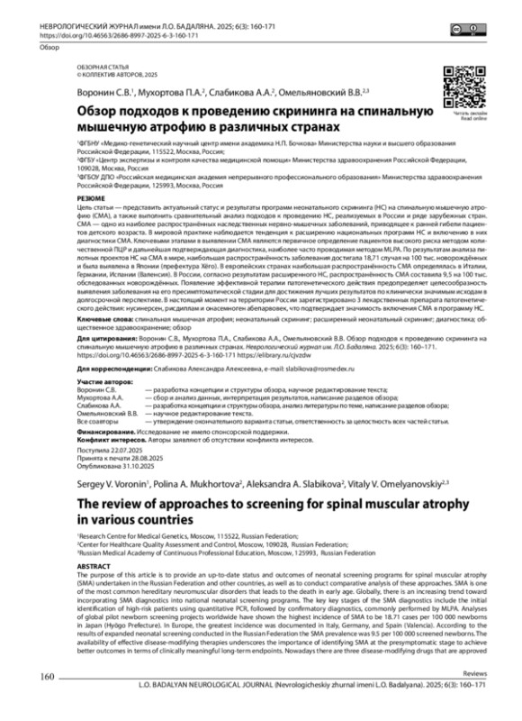 Цель статьи — представить актуальный статус и результаты программ неонатального скрининга (НС) на спинальную мышечную атро- фию (СМА), а также выполнить сравнительный анализ подходов к проведению НС, реализуемых в России и ряде зарубежных стран. СМА — одно из наиболее распространённых наследственных нервно-мышечных заболеваний, приводящее к ранней гибели пациен- тов детского возраста. В мировой практике наблюдается тенденция к расширению национальных программ НС и включению в них диагностики СМА. Ключевыми этапами в выявлении СМА являются первичное определение пациентов высокого риска методом коли- чественной ПЦР и дальнейшая подтверждающая диагностика, наиболее часто проводимая методом MLPA. По результатам анализа пи- лотных проектов НС на СМА в мире, наибольшая распространённость заболевания достигала 18,71 случая на 100 тыс. новорождённых и была выявлена в Японии (префектура Хёго). В европейских странах наибольшая распространённость СМА определялась в Италии, Германии, Испании (Валенсия). В России, согласно результатам расширенного НС, распространённость СМА составила 9,5 на 100 тыс. обследованных новорождённых. Появление эффективной терапии патогенетического действия предопределяет целесообразность выявления заболевания на его пресимптоматической стадии для достижения лучших результатов по клинически значимым исходам в долгосрочной перспективе. В настоящий момент на территории России зарегистрировано 3 лекарственных препарата патогенетиче- ского действия: нусинерсен, рисдиплам и онасемноген абепарвовек, что подтверждает значимость включения СМА в программу НС.