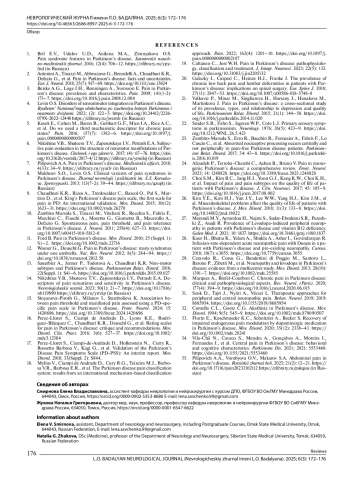 1. Бриль Е.В., Удалов Ю.Д., Аникина М.А., Зимнякова О.С. Особенности болевых синдромов при болезни Паркинсона (обзор). Саратовский научно-медицинский журнал. 2016; 12(4): 706-12.