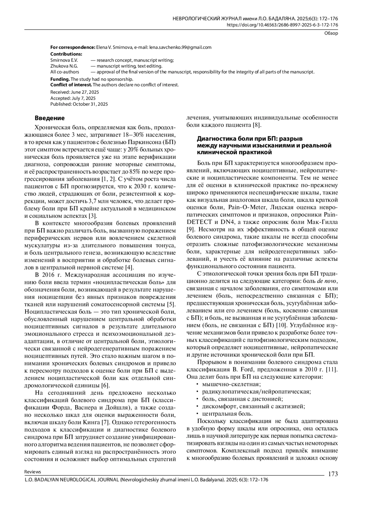 14. Никишина В.Б., Шутеева Т.В., Запесоцкая И.В., Петраш Е.А. Дескрипторы болевых ощущений и чувствительность при болезни Паркинсона. Неврологический вестник. 2023; 50(1): 21-7. DOI: 10.17816/nb119890