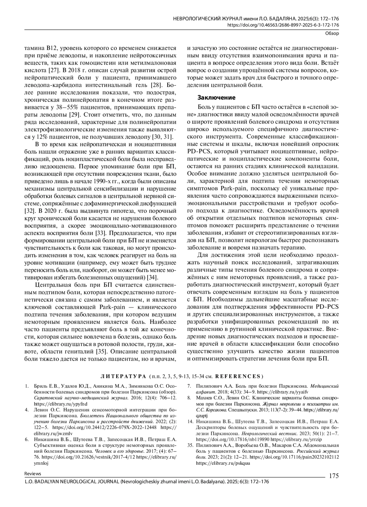 35. Пилипович А.А., Воробьева О.В., Макаров С.А. Абдоминальная боль у пациентов с болезнью Паркинсона. Российский журнал боли. 2023; 21(2): 12-21.
