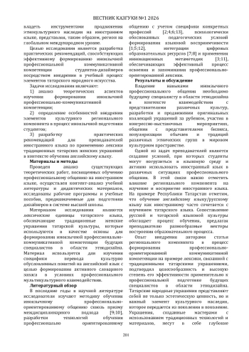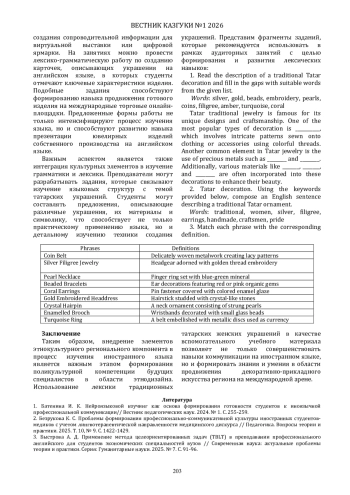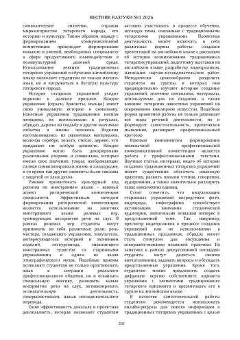 В статье рассматривается процесс формирования иноязычной профессиональной компетенции посредством внедрения в учебный процесс элементов традиционной татарской культуры. Авторы подчеркивают важность интеграции регионального компонента в процесс иноязычной подготовки студентов, в том числе с целью расширения их профессионального кругозора и развития поликультурной компетенции. Представлены приемы использования лексики традиционных татарских женских украшений в качестве вспомогательного учебного материала при изучении английского языка будущими специалистами в области этнодизайна.