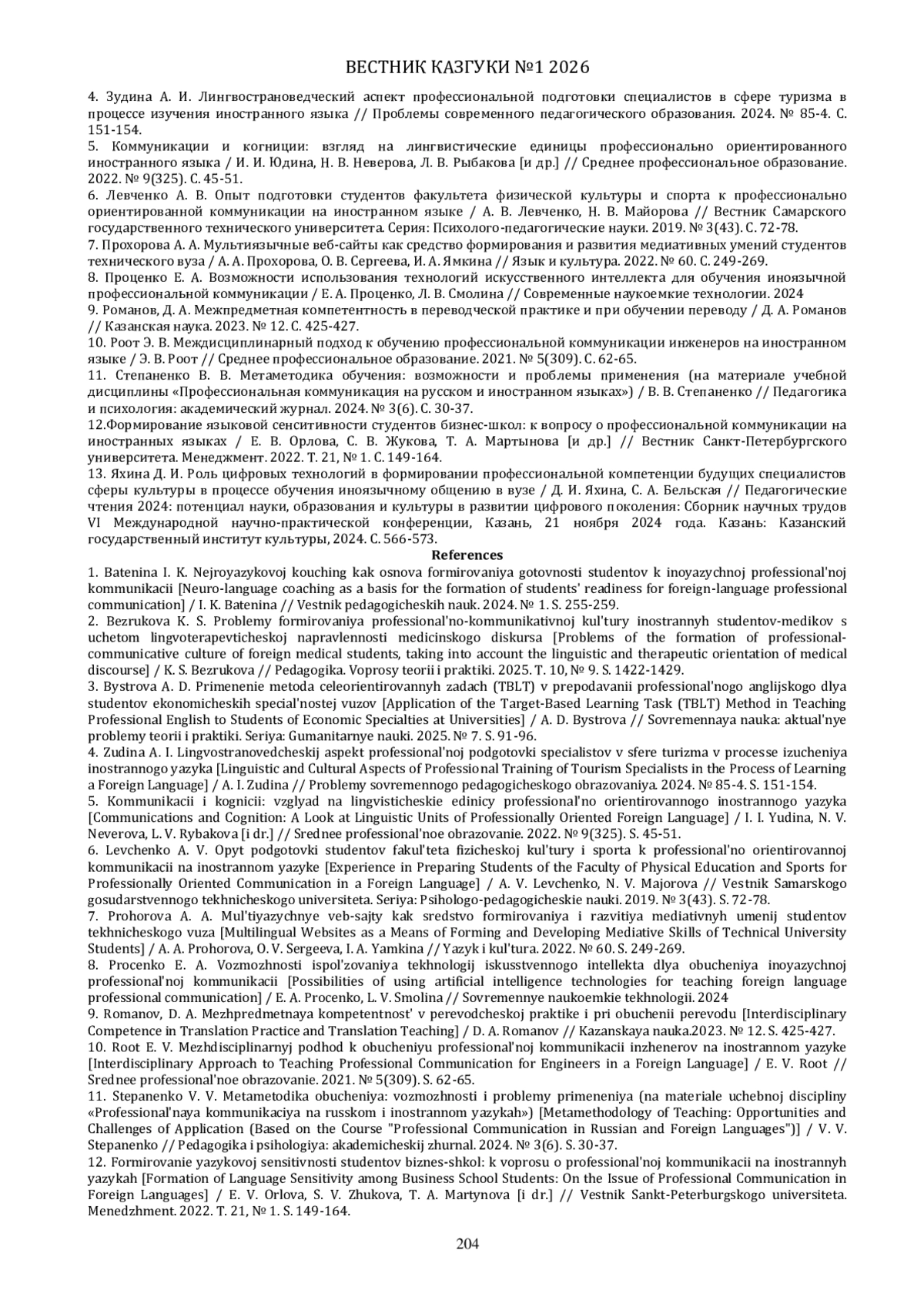1. Батенина И. К. Нейроязыковой коучинг как основа формирования готовности студентов к иноязычной профессиональной коммуникации// Вестник педагогических наук. 2024. № 1. С. 255-259. EDN: FOBLQD