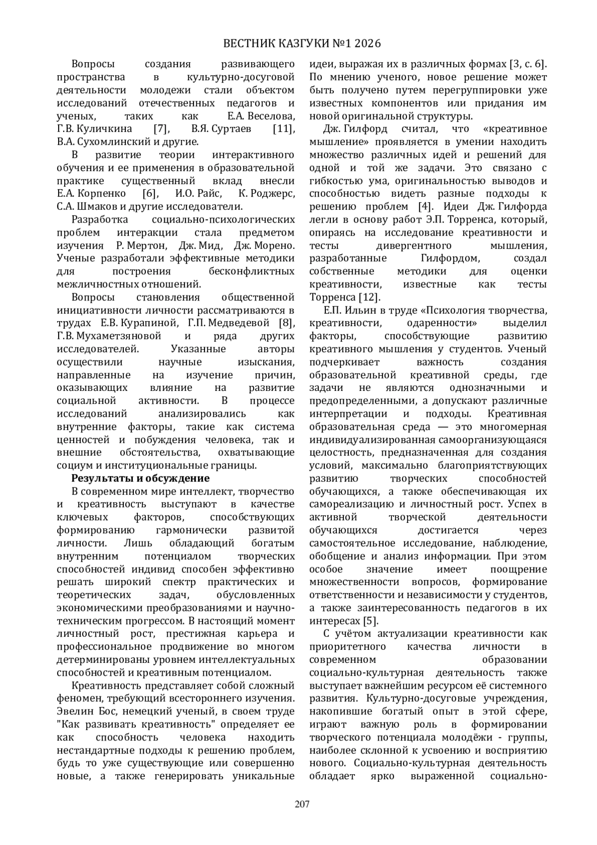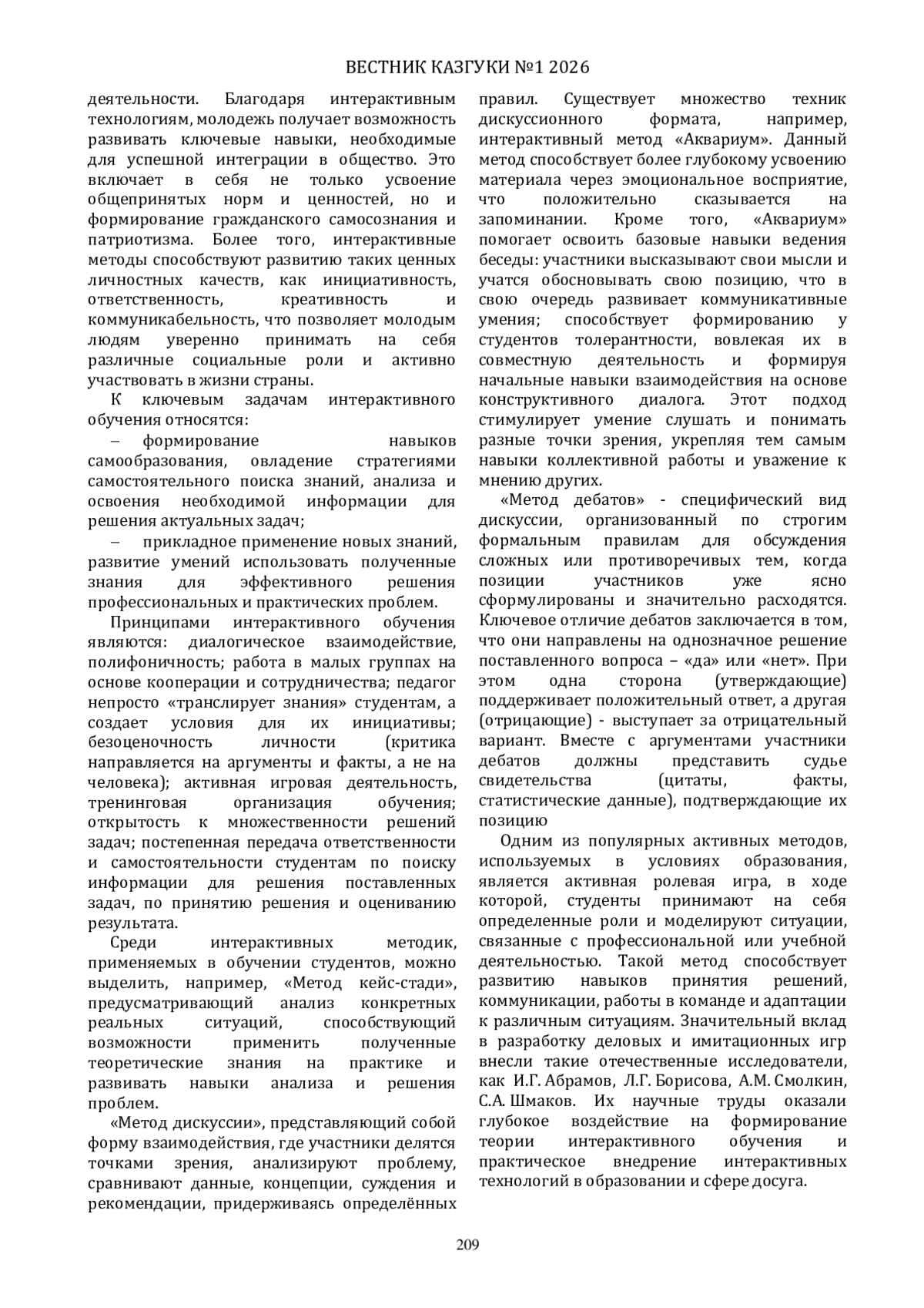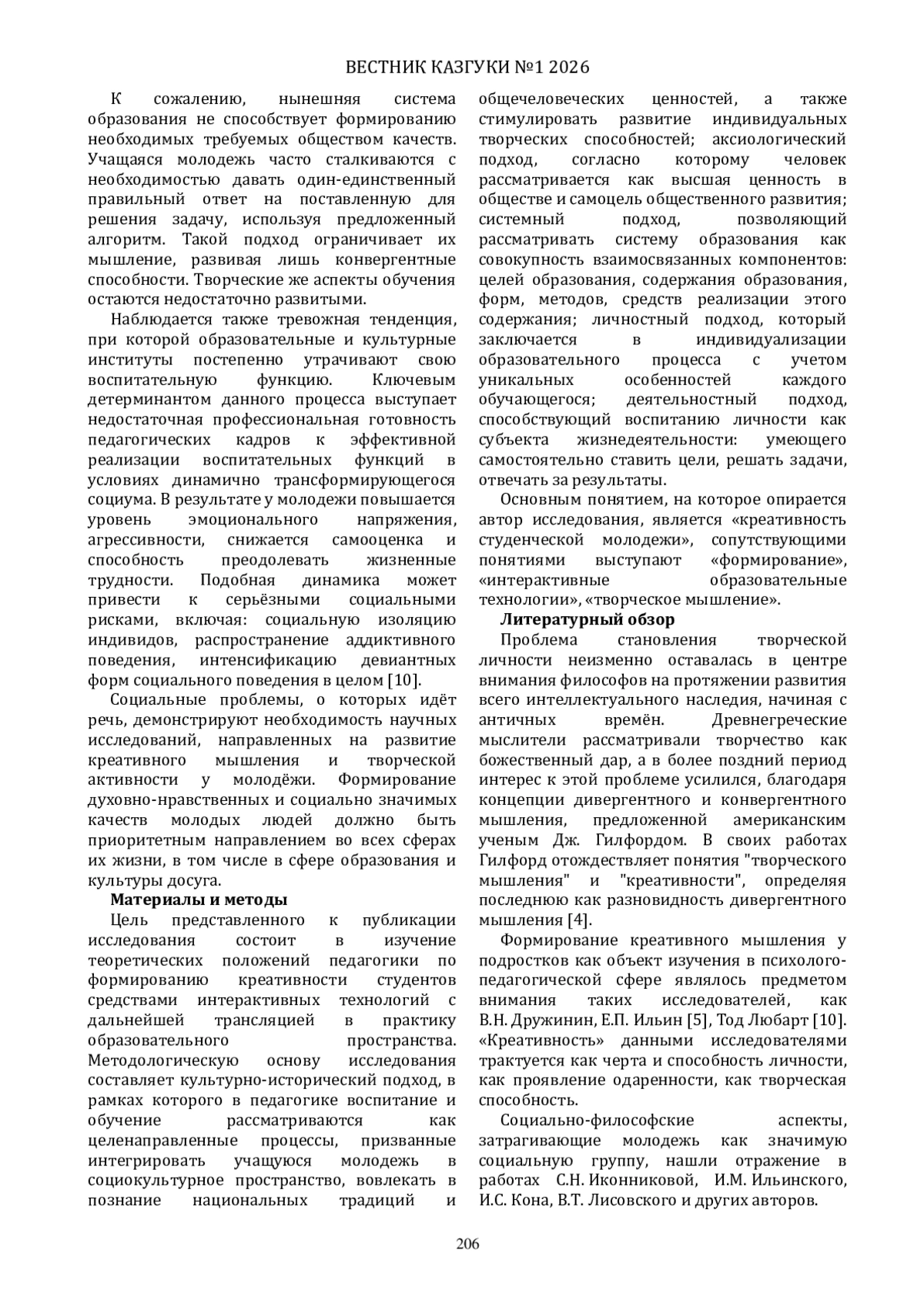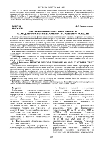 В статье рассматривается процесс формирования креативного мышления и раскрытия творческого потенциала у молодежи в контексте взаимодействия учреждений культуры и образования. Проводится психолого-педагогический анализ понятия «креативность», исследуется его сущность и многогранность. В рамках исследования анализируется образовательный и развивающий потенциал интерактивных технологий, выявляется их определяющая роль в развитии креативности студенческой молодежи. Анализируются различные формы и виды интерактивных методов, применяемых в сфере образования и социокультурной досуговой практики для стимулирования творческого развития молодежи. Изучаются принципы организации занятий и мероприятий с использованием интерактивных технологий в развивающем образовательном и социально-культурном процессе.