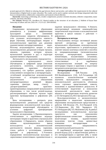 В статье рассматривается роль музыковедческих дисциплин в художественном образовании и их значение для формирования исполнительской культуры и креативных компетенций обучающихся. Авторы отмечают, что в условиях цифровой трансформации музыкального образования возрастает потребность в согласовании теоретической подготовки и исполнительской практики на основе практико-ориентированного цикла «анализ → действие → рефлексия». На основе анализа отечественных и зарубежных источников обоснован механизм, в котором музыковедение выступает ядром интеграции технических навыков, историко-стилевой осведомленности и интерпретационных решений. Уточнено методологическое значение аксиологического подхода и praxial-подхода (D. J. Elliott) для уменьшения разрыва между теорией и практикой; обозначены требования к культурологической интерпретации цифровых инструментов в обучении музыке. Результаты могут быть использованы при обновлении учебных программ и проектировании интегрированных заданий, ориентированных на интерпретацию, коллективное сочинение и музыкально-критическую рефлексию.