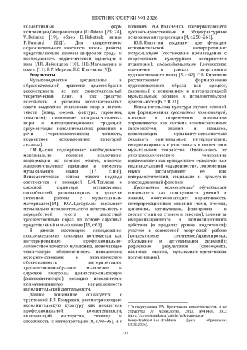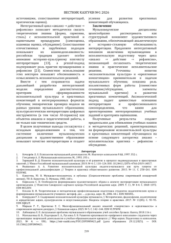 7. Козлов Н. И. Теоретическая и методическая профессиональная подготовка студентов педагогических вузов к формированию музыкальности учащихся: автореф. дис. … д-ра пед. наук. М., 2006. 44 с. EDN: NIODUL