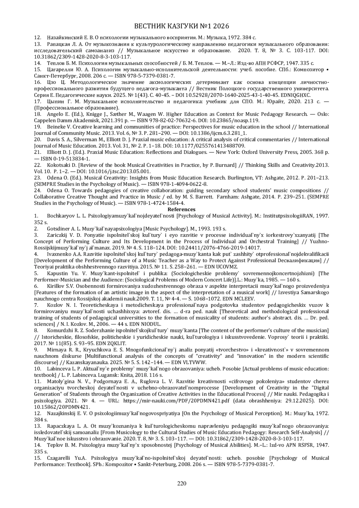 16. Цзо Ц. Методологическое значение аксиологических детерминант как основа концепции личностно-профессионального развития будущего педагога-музыканта // Вестник Полоцкого государственного университета. Серия Е. Педагогические науки. 2025. № 1(43). С. 40-45. 10.52928/2070-1640-2025-43-1-40-45. EDN. DOI: 10.52928/2070-1640-2025-43-1-40-45.EDNIQGHXC EDN: IQGHXC