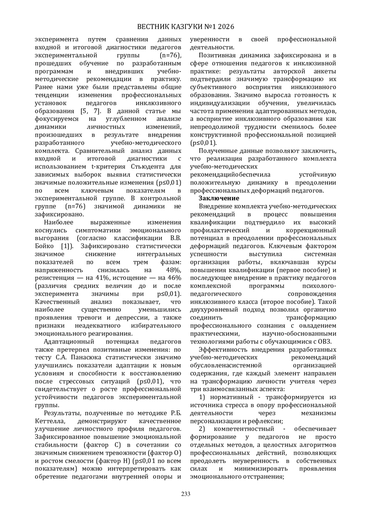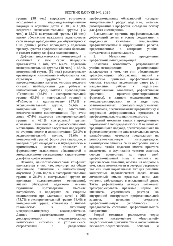 Цель статьи - обоснование и эмпирическая проверка потенциала комплекта авторских учебно-методических рекомендаций «Образовательные практики обучающихся с ОВЗ» и «Эффективные практики обучения детей с ОВЗ: программа психолого-педагогического сопровождения инклюзивного класса» как средства профилактики и коррекции профессиональных деформаций педагогов. Исследование базируется на аксиологическом, личностно-ориентированном, компетентностном и системно-деятельностном подходах. Основным методом выступил формирующий эксперимент на выборке 76 педагогов Республики Татарстан. Выявлены причины, провоцирующие деформации в инклюзивной среде: нормативная неопределенность, дефицит педагогических компетенций в работе с обучающимися с ОВЗ, рассогласование гуманистических ценностей инклюзивного образования и устоявшихся педагогических стереотипов. Доказано, что внедрение разработанных рекомендаций способствует снижению уровня напряженности на 48%, резистенции на 41% и истощения на 46% за счет трех механизмов: персонализации правовых норм, освоения безопасных технологий работы с обучающимися с ОВЗ и развития профессиональной рефлексии. Представленные разработки могут быть тиражированы в системе повышения квалификации для укрепления кадрового потенциала инклюзивных школ за счет освоения педагогами стратегий профилактики и коррекции профессиональных деформаций.