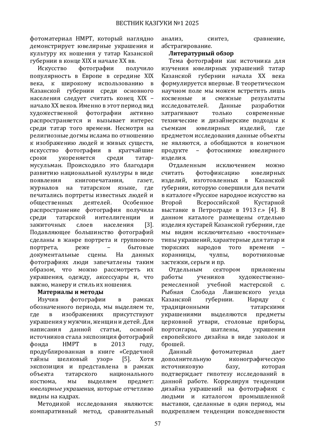 Целью статьи является подтвердить гипотезу автора в том, что фотография является достоверным и информативно богатым источником для изучения ювелирных изделий в материальной культуре татар, который отображает историю повседневности, культурные течения в моде и в стилевых приоритетах обозначенного периода. Статья рассматривает ювелирные украшения, которые отображены на фотографиях, выделяет их виды, типологию и особенности ношения.