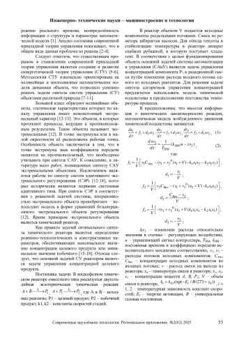 Большой класс образуют нелинейные объекты, статическая характеристика которых по каналу управления имеет немонотонный экстремальный характер [12-13]. Это объекты, в которых протекают процессы, ведущие к противоположным результатам. Такие объекты называют экстремальными [12]. В точке экстремума или в малой окрестности ее расположена рабочая точка. Особенность объекта заключается в том, что в точке экстремума знак коэффициента передачи меняется на противоположный, что необходимо учитывать при синтезе САУ. К сожалению, в литературе мало работ, посвященных синтезу САУ экстремальными объектами. Исключением являются работы по синтезу систем адаптивного экстремального регулирования (СЭР) [12-14], которые исторически являются первыми системами адаптивного типа. При синтезе СЭР в соответствии с решаемой задачей системы, инерционностью экстремального объекта пренебрегают - используют модель в форме уравнений безынерционного экстремального объекта регулирования [12]. Ярким примером экстремального объекта является химический реактор.