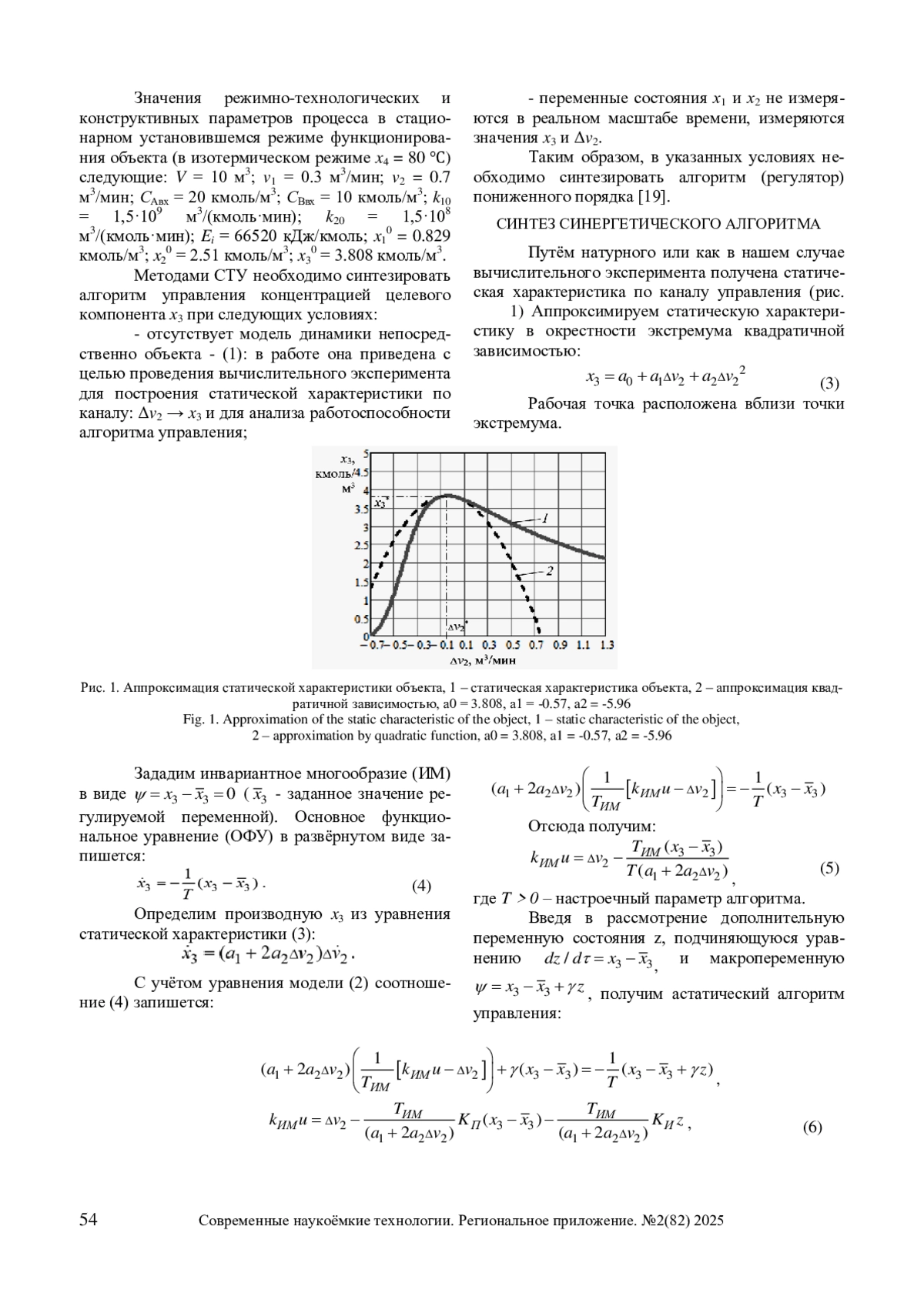 В статье представлены результаты решения задачи синтеза алгоритмов управления экстремальным нелинейным объектом (на примере жидкофазного химического реактора непрерывного действия с перемешиванием) в условиях ограниченной информации о динамике объекта. Статическая характеристика объекта по каналу регулирования задана в виде квадратичной зависимости. Синтез безынерционного и астатического алгоритмов управления осуществлен методами аналитического конструирования агрегированных регуляторов. Для сравнительного анализа алгоритмов проведен каскадный синтез закона управления в предположении, что динамическая модель объекта задана. Моделирование системы управления показало работоспособность синтезированных алгоритмов: устойчивость переходных процессов управления, отсутствие статической ошибки. Предложенный подход к разработке системы управления может быть распространен и на случаи нелинейных статических характеристик, отличных от квадратичной формы.