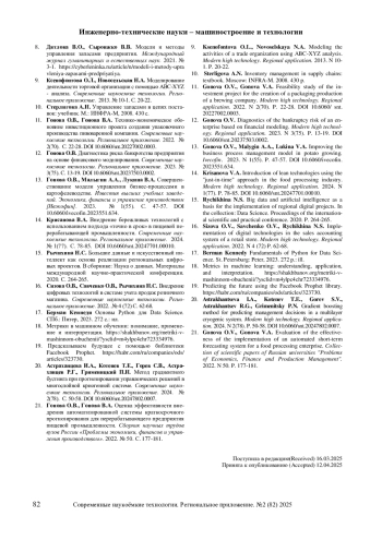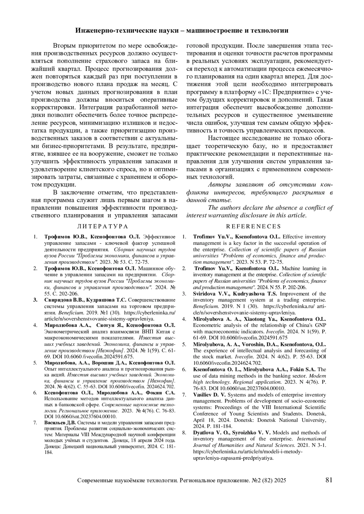 2. Трофимов Ю.В., Ксенофонтова О.Л. Машинное обучение в управлении запасами на предприятии. Сборник научных трудов вузов России “Проблемы экономики, финансов и управления производством”. 2024. № 55. С. 202-206.