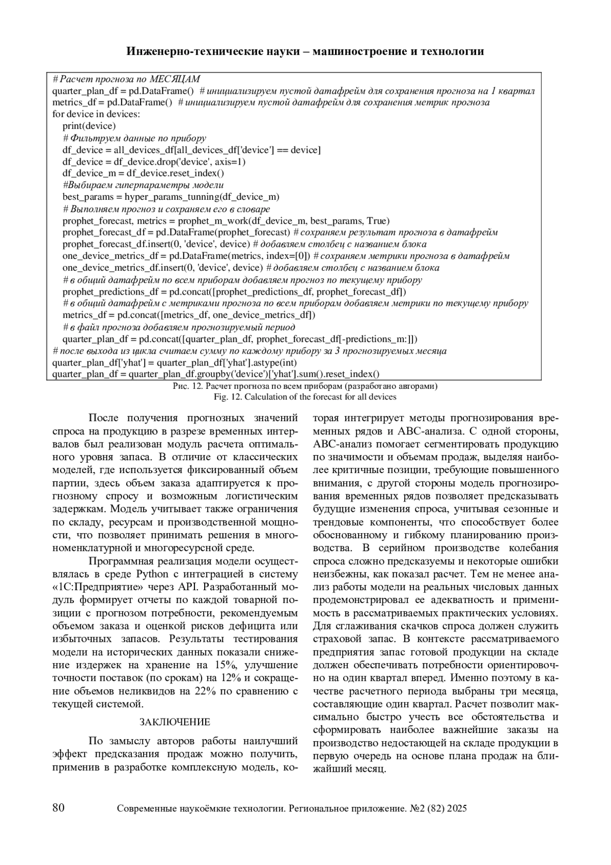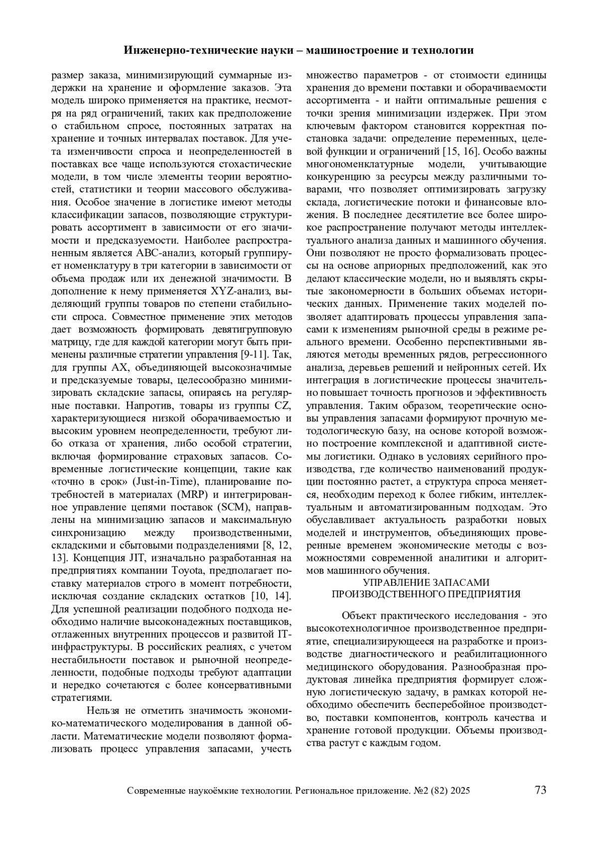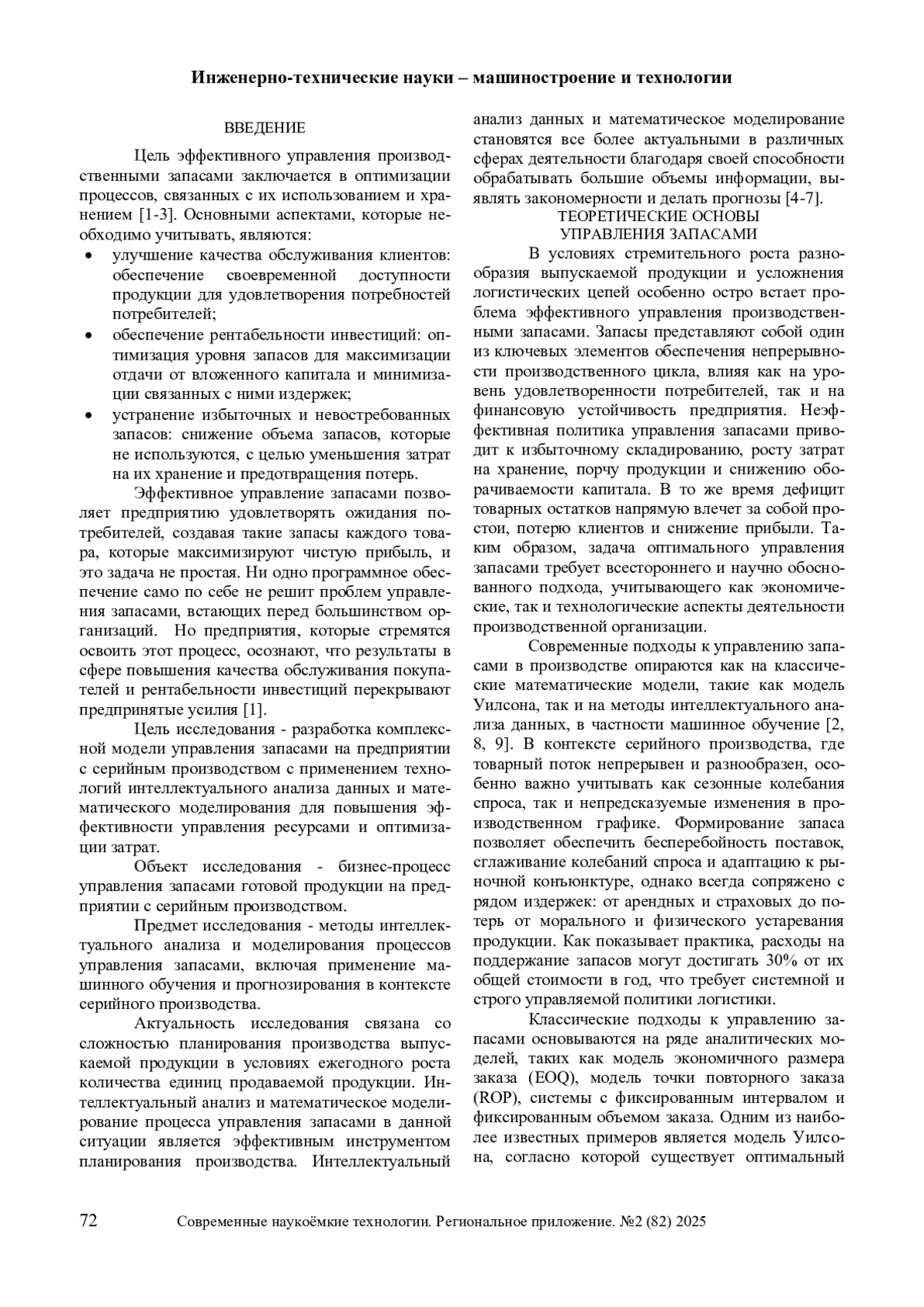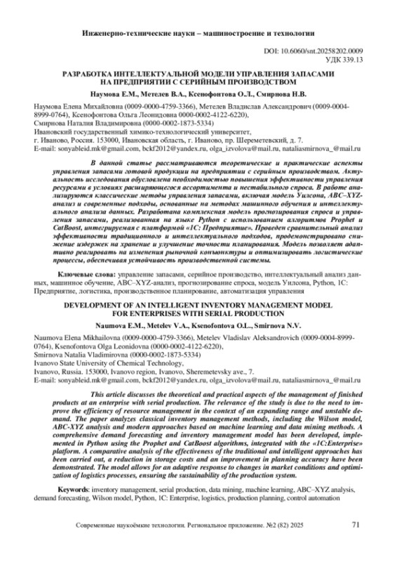 В данной статье рассматриваются теоретические и практические аспекты управления запасами готовой продукции на предприятии с серийным производством. Актуальность исследования обусловлена необходимостью повышения эффективности управления ресурсами в условиях расширяющегося ассортимента и нестабильного спроса. В работе анализируются классические методы управления запасами, включая модель Уилсона, ABC–XYZ-анализ и современные подходы, основанные на методах машинного обучения и интеллектуального анализа данных. Разработана комплексная модель прогнозирования спроса и управления запасами, реализованная на языке Python с использованием алгоритмов Prophet и CatBoost, интегрируемая с платформой «1С: Предприятие». Проведен сравнительный анализ эффективности традиционного и интеллектуального подходов, продемонстрировано снижение издержек на хранение и улучшение точности планирования. Модель позволяет адаптивно реагировать на изменения рыночной конъюнктуры и оптимизировать логистические процессы, обеспечивая устойчивость производственной системы.