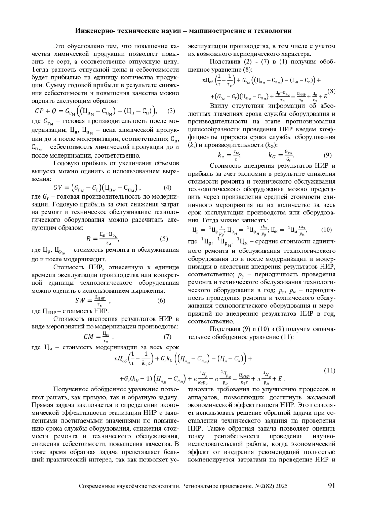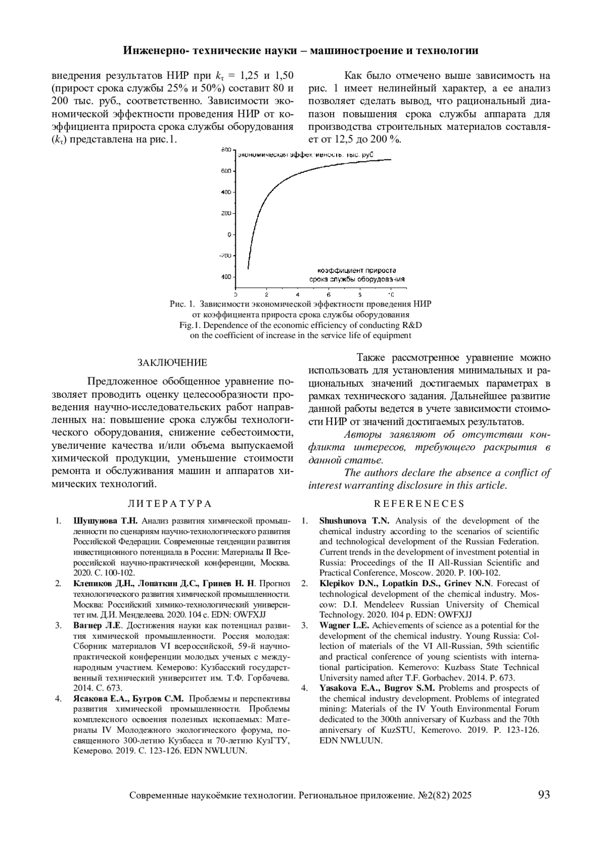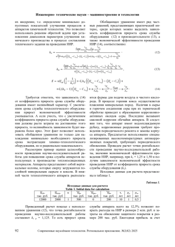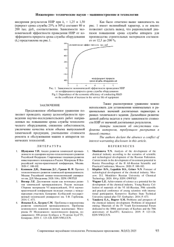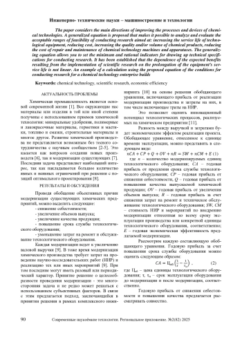 В работе рассмотрены основные направления совершенствования процессов и аппаратов химических технологий. Предложено обобщенное уравнение, позволяющее провести анализ и оценить допустимые диапазоны целесообразности проведения научно-исследовательских работ направленных на: повышение срока службы технологического оборудования, снижение себестоимости, увеличение качества и/или объема выпускаемой химической продукции, уменьшение стоимости ремонта и обслуживания машин и аппаратов химических технологий. Обобщающее уравнение позволяет установить минимальный и рациональные показатели, для составления технического задания на проведение научно-исследовательских работ. Установлено, что зависимость ожидаемой выгоды в результате реализации научно-исследовательских работ от продления срока службы оборудования имеет не линейный вид. Приведен пример расчета с использованием предложенного уравнения условий проведения научно-исследовательских работ для предприятия химической технологии строительных материалов.