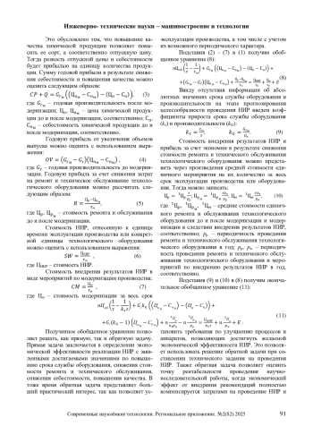Разность между выручкой и затратами будет экономическим эффектом реализации проекта. Обобщающее уравнение, отнесенное к единице времени эксплуатации, можно представить в следующем виде: пС А + СР + (( + 0 V + = + пСМ + Е (1) где п - количество модернизируемых единиц технологического оборудования; СА - годовая прибыль от продления срока службы технологического оборудования; СР - годовая прибыль от снижения себестоимости, Q - годовая прибыль от повышения качества выпускаемой химической продукции; ОУ - годовая прибыль от увеличения объемов выпуска; Я - годовая прибыль за счет снижения затрат на ремонт и техническое обслуживание технологического оборудования; SW, СМ - стоимость НИР и мероприятий по внедрению модернизации отнесенная ко всему сроку эксплуатации производства или конкретной единицы технологического оборудования, соответственно; Е - годовая экономическая эффективность предлагаемой модернизации.