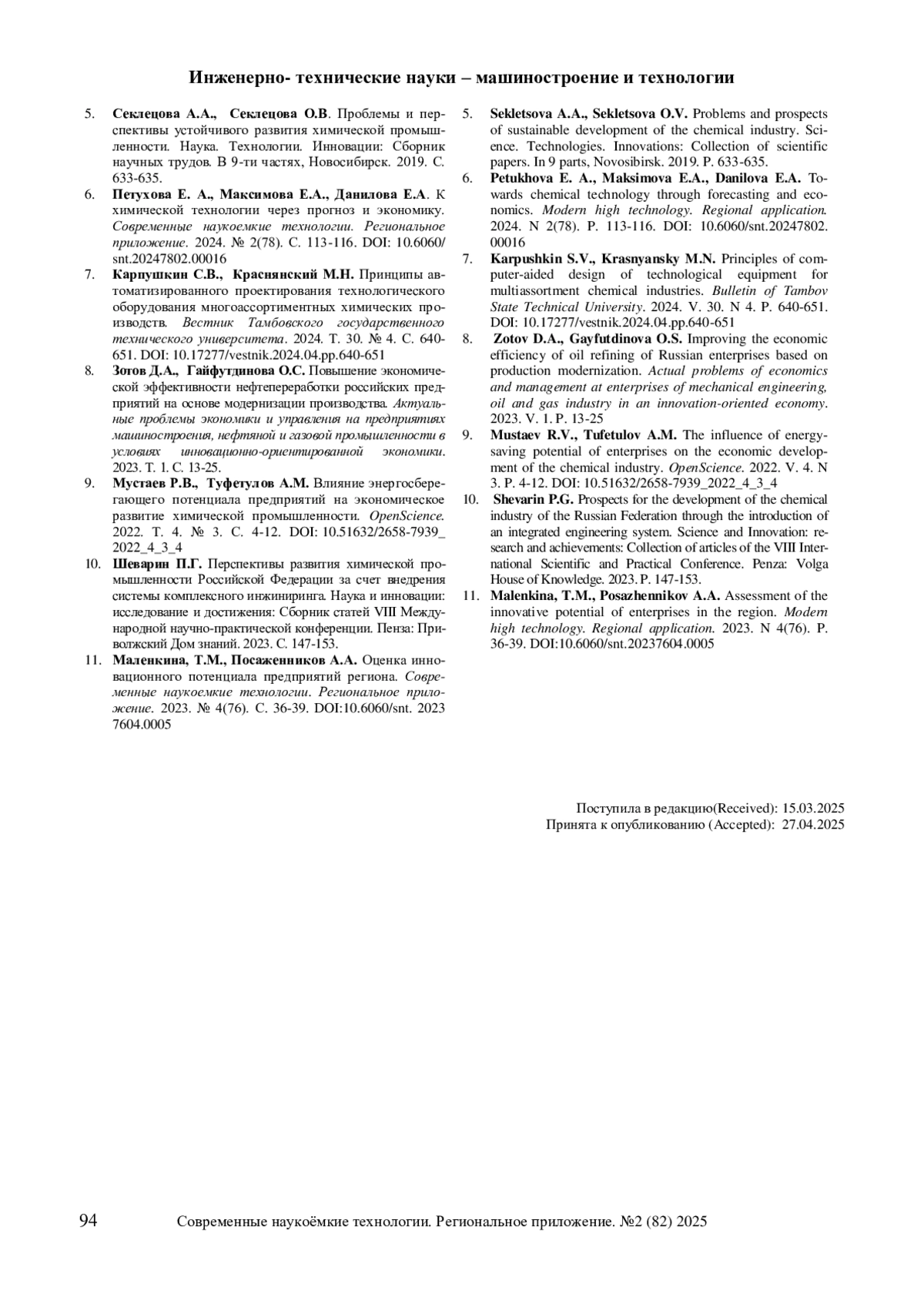 4. Ясакова Е.А., Бугров С.М. Проблемы и перспективы развития химической промышленности. Проблемы комплексного освоения полезных ископаемых: Материалы IV Молодежного экологического форума, посвященного 300-летию Кузбасса и 70-летию КузГТУ, Кемерово. 2019. С. 123-126. EDN МтЦШ.