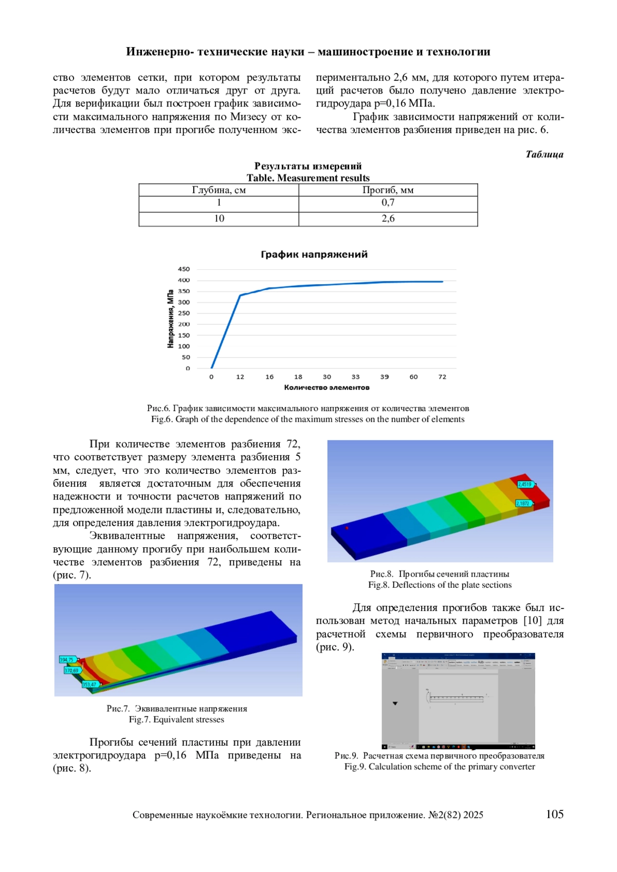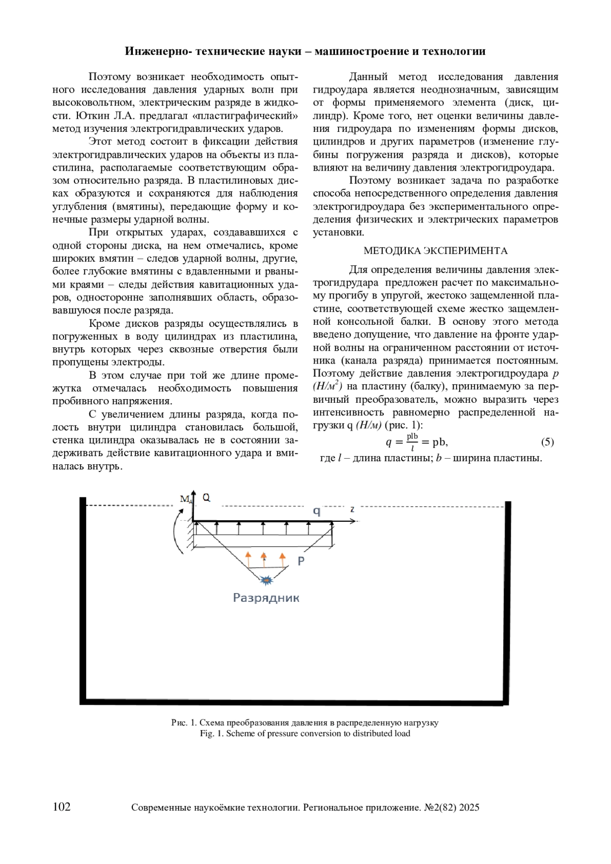 В статье представлены результаты теоретических и экспериментальных исследований по разработке методики измерения давления электрогидроудара в жидкой среде. Для определения величины давления электрогидрудара предложен расчет основанный на максимальном прогибе первичного преобразователя (жестоко защемленной пластины), соответствующего схеме жестко защемленной консольной балки в момент прохождения ударной волны от единичного электрического разряда. Разработана установка для определения давления при электрогидроударе с применением микроконтроллера Arduino Nano с контроллером ATmega328. Получено выражение для расчета прогибов методом начальных параметров. Проведен расчет давления электрогидроудара в программном комплексе ANSYS. Расхождение между полученнгыми значениями прогиба аналитическим методом и в программном комплексе ANSYS не превышает 1%. Предложенный способ измерения давления может быть применен для исследования давления в установках электрогидроудара.