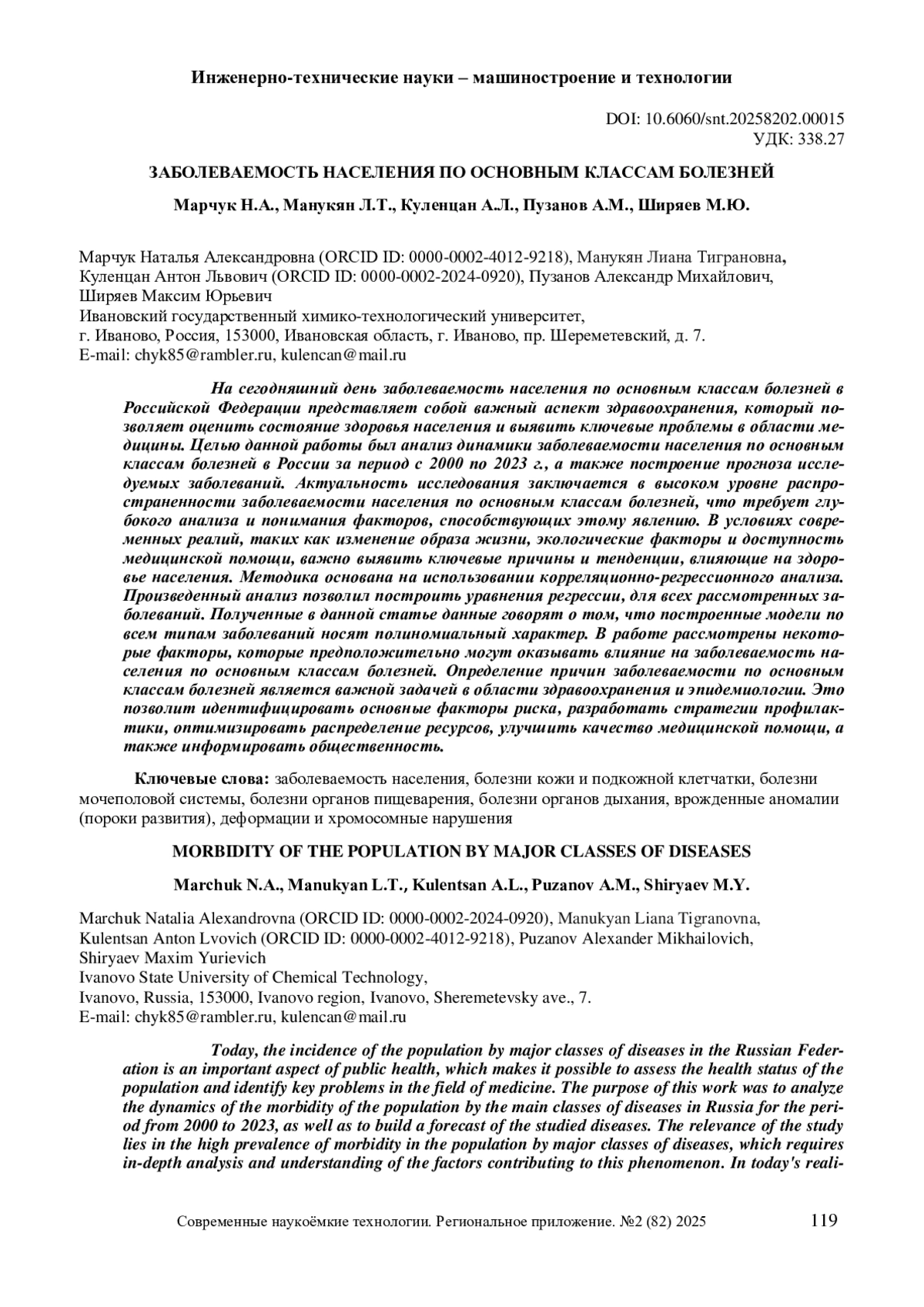 На сегодняшний день заболеваемость населения по основным классам болезней в Российской Федерации представляет собой важный аспект здравоохранения, который позволяет оценить состояние здоровья населения и выявить ключевые проблемы в области медицины. Целью данной работы был анализ динамики заболеваемости населения по основным классам болезней в России за период с 2000 по 2023 г., а также построение прогноза исследуемых заболеваний. Актуальность исследования заключается в высоком уровне распространенности заболеваемости населения по основным классам болезней, что требует глубокого анализа и понимания факторов, способствующих этому явлению. В условиях современных реалий, таких как изменение образа жизни, экологические факторы и доступность медицинской помощи, важно выявить ключевые причины и тенденции, влияющие на здоровье населения. Методика основана на использовании корреляционно-регрессионного анализа. Произведенный анализ позволил построить уравнения регрессии, для всех рассмотренных заболеваний. Полученные в данной статье данные говорят о том, что построенные модели по всем типам заболеваний носят полиномиальный характер. В работе рассмотрены некоторые факторы, которые предположительно могут оказывать влияние на заболеваемость населения по основным классам болезней. Определение причин заболеваемости по основным классам болезней является важной задачей в области здравоохранения и эпидемиологии. Это позволит идентифицировать основные факторы риска, разработать стратегии профилактики, оптимизировать распределение ресурсов, улучшить качество медицинской помощи, а также информировать общественность.