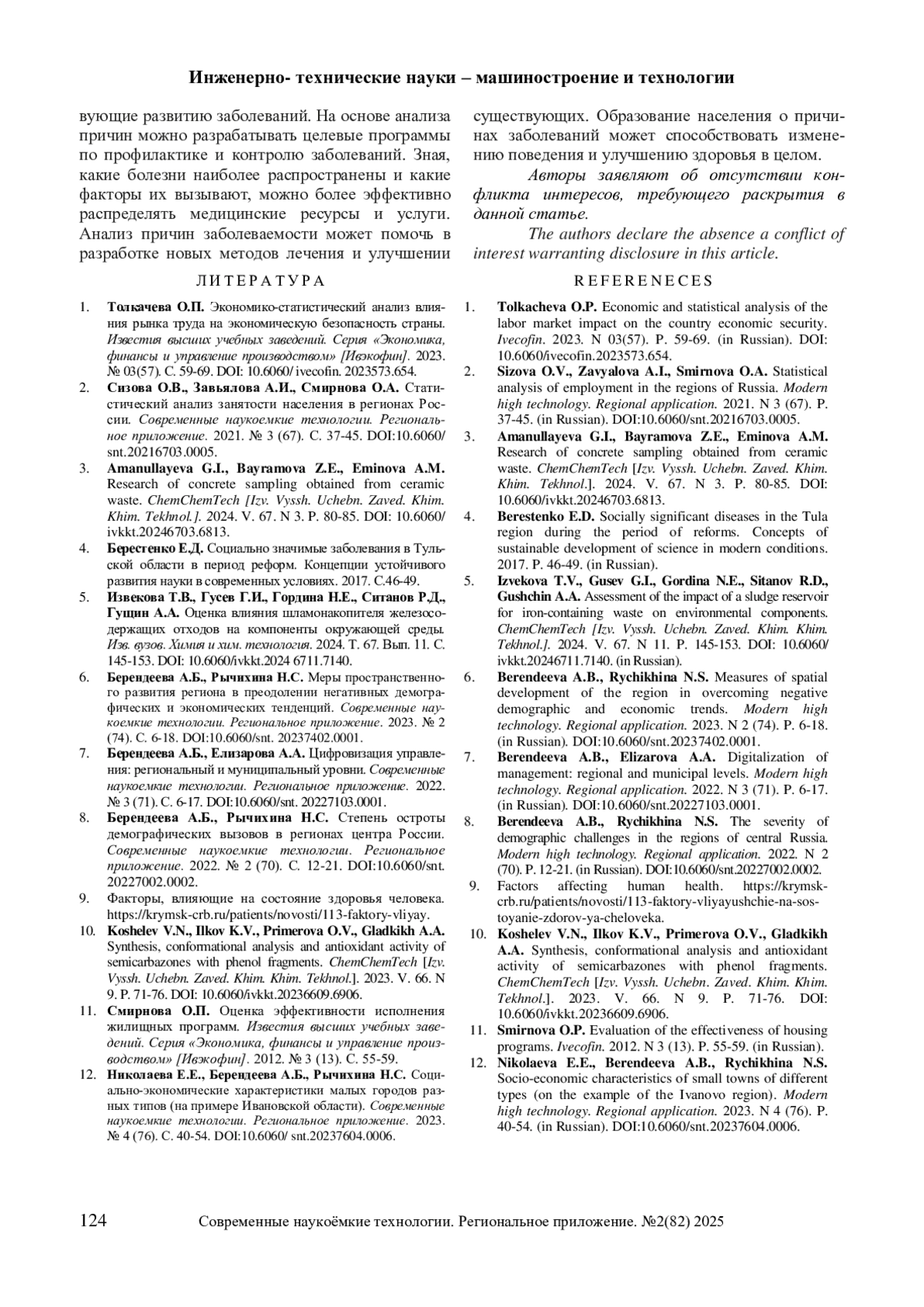 12. Николаева Е.Е., Берендеева А.Б., Рычихина Н.С. Социально-экономические характеристики малых городов разных типов (на примере Ивановской области). Современные наукоемкие технологии. Региональное приложение. 2023. № 4 (76). С. 40-54. DOI: 10.6060/ snt.20237604.0006.